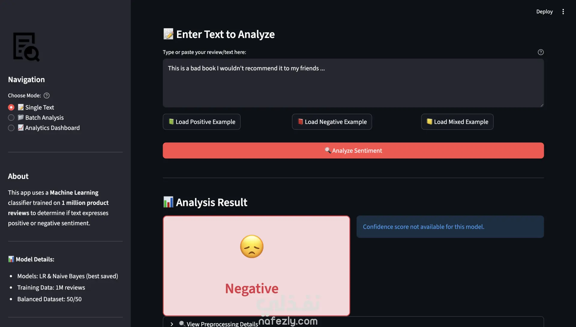 تطبيق ويب تفاعلي يعتمد على تقنيات تعلم الآلة (Machine Learning) ومعالجة اللغات الطبيعية (NLP) لتحليل نصوص تقييمات المنتجات والعملاء، وتصنيفها بدقة إلى آراء إيجابية (Positive) أو سلبية (Negative). تم بناء وتدريب النماذج على مجموعة بيانات ضخمة ومتوازنة تحتوي على مليون تقييم (1 Million Reviews)، مما يجعله أداة قوية وموثوقة للشركات لفهم انطباعات عملائها واتخاذ قرارات مبنية على البيانات. أهم المميزات (Key Features): تحليل النصوص الفردية (Single Text Analysis): إمكانية إدخال نص مباشر أو تقييم لمعرفة الانطباع العام فوراً مع واجهة مستخدم توضح النتيجة بشكل مرئي وسهل. التحليل المجمع (Batch Analysis): دعم تحليل كميات كبيرة من التقييمات في وقت واحد، سواء عن طريق إدخال نصوص متعددة في واجهة التطبيق، أو من خلال رفع ملفات البيانات (CSV Upload)، مما يوفر الكثير من الوقت للشركات. شفافية المعالجة المسبقة (Preprocessing Details): التطبيق لا يعطي النتيجة فقط، بل يعرض للمستخدم الخطوات الاحترافية التي تمت على النص الأصلي لتنظيفه قبل إدخاله للنموذج (مثل إزالة الروابط، التشكيل، والكلمات غير المؤثرة). لوحة تحكم تحليلية (Analytics Dashboard): (بناءً على القائمة الجانبية للتطبيق) لاستعراض إحصائيات عامة عن البيانات التي تم تحليلها. التقنيات والنماذج المستخدمة (Technical Highlights): خوارزميات تعلم الآلة: تم تدريب واختبار عدة نماذج، وتم الاعتماد على Logistic Regression و Naive Bayes كأفضل النماذج أداءً للمشروع. معالجة اللغات الطبيعية (NLP Pipeline): تم بناء خط أنابيب (Pipeline) متكامل لتنظيف ومعالجة النصوص يمر بـ 7 خطوات احترافية تشمل: تحويل الحروف إلى صيغة صغيرة (Lowercase). فك الاختصارات اللغوية (Expanding Contractions). إزالة أكواد HTML والروابط (URLs). إزالة الرموز الخاصة والأرقام. إزالة الكلمات التوقفية (Stopwords) مع الحفاظ على كلمات النفي لضمان عدم تغيير معنى المشاعر. إرجاع الكلمات لجذورها الأصلية (Lemmatization). الهدف والقيمة المضافة: يقدم هذا المشروع حلاً تقنياً متكاملاً (End-to-End ML Project) يوضح القدرة على التعامل مع البيانات الضخمة (Big Data)، وتطبيق مفاهيم الـ NLP المعقدة، وبناء واجهة مستخدم تفاعلية (Web App) تُمكّن العميل النهائي من استخدام نماذج الذكاء الاصطناعي بكل سهولة لتحسين جودة منتجاته وخدماته.
