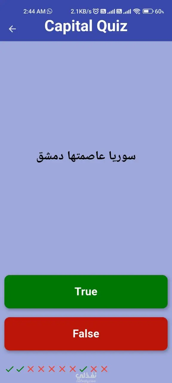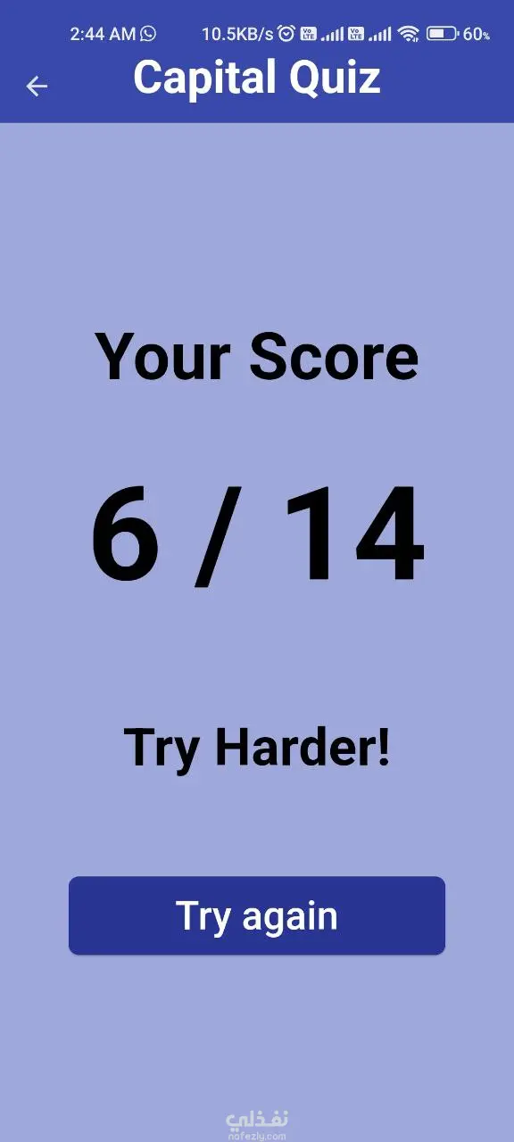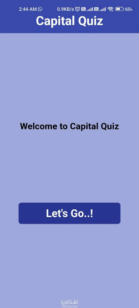 تطبيق Flutter تفاعلي لاختبار معلومات المستخدم عن عواصم العالم. يتضمن 14 سؤالاً باختيار من متعدد، تتبع النتيجة لحظياً، شاشة نتائج في نهاية كل جولة، وانتقالات سلسة بين الأسئلة.