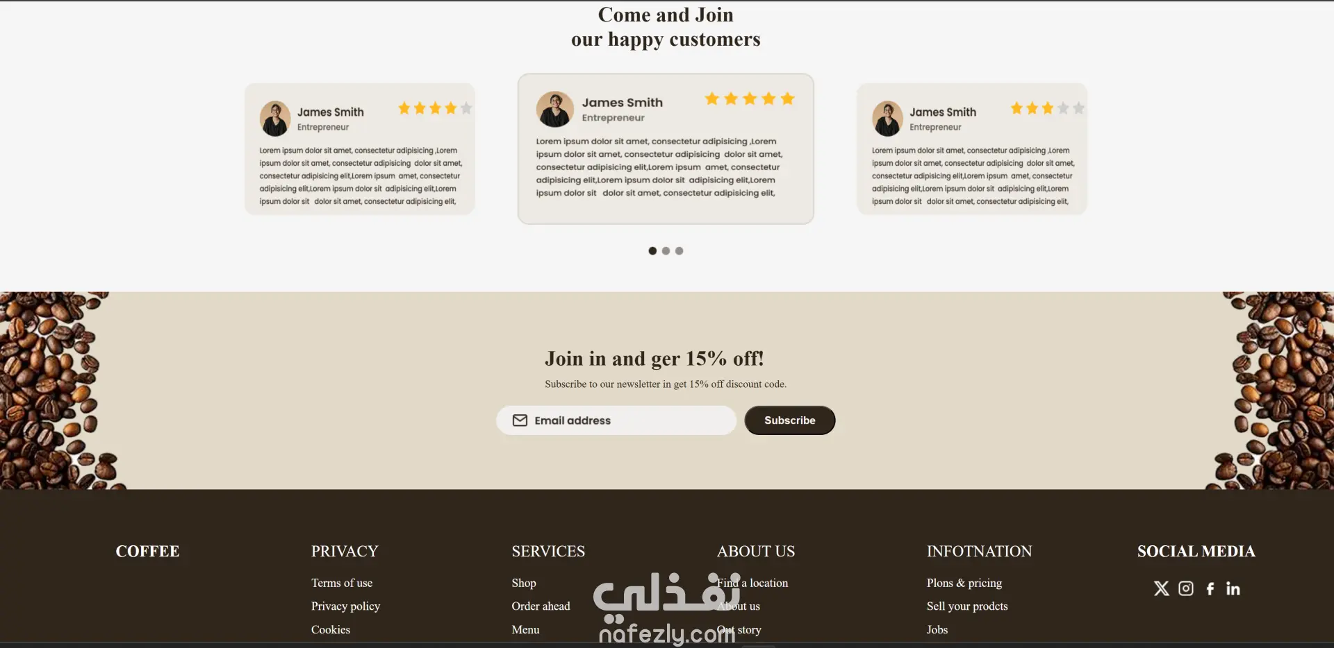 Coffee Landing Page – Responsive Website قمت بتصميم وتطوير صفحة هبوط حديثة لموقع خاص بالقهوة تهدف إلى عرض المنتجات بطريقة جذابة وتحسين تجربة المستخدم أثناء التصفح. ركزت في هذا المشروع على إنشاء تصميم بصري مميز يعكس هوية العلامة التجارية مع توزيع منظم للمحتوى ليسهل على الزائر استكشاف المنتجات والخدمات. تتضمن الصفحة عدة أقسام أساسية مثل قسم الترحيب (Hero Section)، عرض أنواع القهوة المميزة، قسم الحلويات، آراء العملاء، ونموذج الاشتراك في النشرة البريدية. كما تم تصميم بطاقات المنتجات بطريقة واضحة تساعد المستخدم على تصفح الخيارات بسهولة. تم تطوير الصفحة باستخدام HTML و CSS و JavaScript مع الاهتمام بكتابة كود نظيف ومنظم، بالإضافة إلى جعل الموقع Responsive بالكامل ليعمل بكفاءة على جميع الأجهزة مثل الهواتف المحمولة والتابلت وأجهزة الكمبيوتر. الهدف من هذا المشروع هو تقديم تجربة تصفح سلسة مع تصميم عصري يساعد على إبراز المنتجات وجذب انتباه المستخدمين.