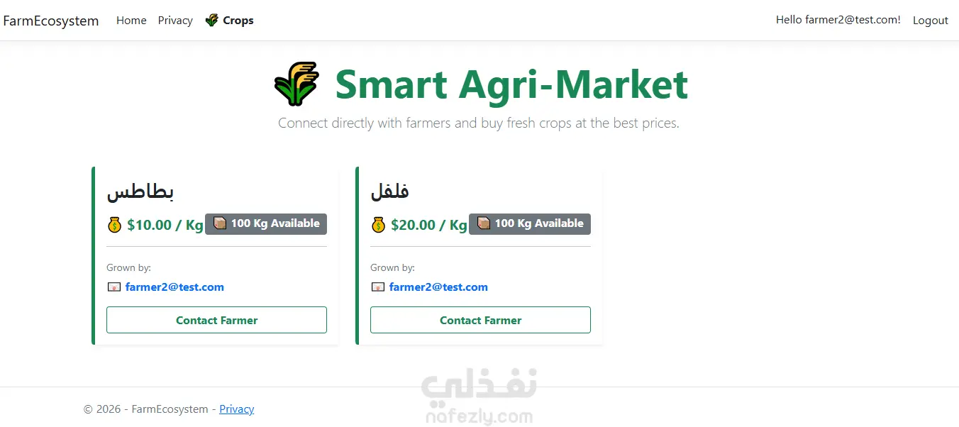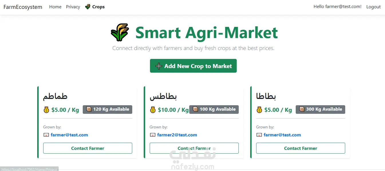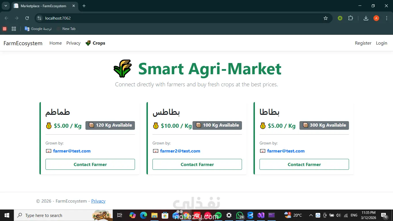منصة إلكترونية متكاملة (B2B Marketplace) تهدف إلى ربط المزارعين مباشرة بالشركات والتجار. المشروع يبرز القدرة على بناء أنظمة معقدة تحتوي على أدوار مختلفة للمستخدمين، وتطبيق مبادئ حماية البيانات (Data Isolation) وفصل الصلاحيات بدقة. ✨ مميزات النظام والمهارات البرمجية (Features): نظام المصادقة والحماية (Identity): تسجيل دخول وإنشاء حسابات آمنة للمزارعين باستخدام Microsoft Identity مع تشفير كلمات المرور. عزل البيانات (Data Isolation & Authorization): لوحة تحكم خاصة (Dashboard) لكل مزارع تضمن عدم تداخل البيانات؛ حيث يدير كل مزارع محاصيله الخاصة (إضافة، تعديل، حذف) دون القدرة على رؤية أو تعديل بيانات المزارعين الآخرين من لوحته. السوق المفتوح (Marketplace): واجهة رئيسية ديناميكية تعرض كافة المحاصيل المتاحة من جميع المزارعين للشركات والتجار، مما يخلق بيئة تنافسية وتجارية فعالة. الربط الآلي للبيانات (Backend Magic): ربط المحاصيل أوتوماتيكياً بمعرف المزارع (User ID) في قاعدة البيانات فور الإضافة، لمنع التلاعب وتأمين مسار البيانات.