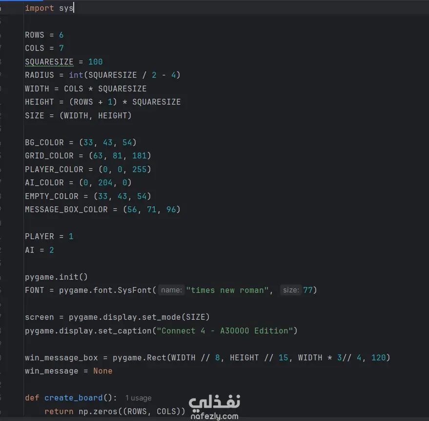 قمت بتطوير لعبة Connect 4 تفاعلية باستخدام Python ومكتبة Pygame مع دمج نظام ذكاء اصطناعي ذكي يتيح اللعب ضد الكمبيوتر بطريقة تنافسية تحاكي التفكير البشري.