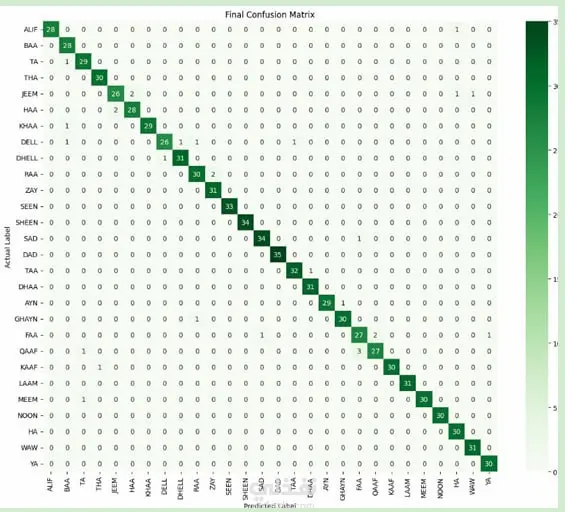 قمتُ بتطوير نظام رؤية حاسوبية (Computer Vision) قادر على التعرف على حروف لغة الإشارة العربية (Arabic Sign Language - ASL) من صور اليد باستخدام تقنيات التعلم العميق (Deep Learning). يهدف المشروع إلى تسهيل التواصل مع الأشخاص الصم وضعاف السمع من خلال ترجمة إشارات اليد تلقائيًا إلى حروف قابلة للقراءة. تم بناء النموذج باستخدام شبكة عصبية التفافية (Convolutional Neural Network - CNN) من الصفر بالكامل دون الاعتماد على Transfer Learning أو نماذج مدربة مسبقًا، وحقق النموذج أداءً عاليًا في التصنيف على بيانات اختبار غير مرئية. الميزات الرئيسية: • تصميم وتنفيذ بنية CNN مخصصة من الصفر. • تصنيف حروف لغة الإشارة العربية من صور إيماءات اليد. • تحقيق دقة اختبار بلغت 97.13٪. تم تقييم النموذج باستخدام: • مصفوفة الالتباس (Confusion Matrix) • قياس الدقة وأداء التصنيف • اختبار التنبؤ على صور جديدة غير مستخدمة أثناء التدريب • القدرة على التمييز بين إيماءات اليد المتشابهة بصريًا بدقة عالية. • تطبيق تقنيات معالجة الصور (Image Preprocessing) وتحسين أداء النموذج (Model Optimization).