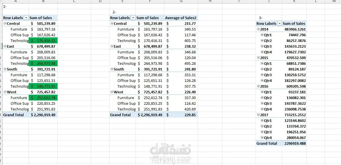 تلخيص البيانات وتحليلها بإستخدام مايكروسوفت إكسل طبقا للمنطقة ونوع المنتج .