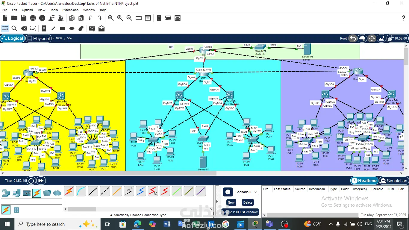 This project demonstrates the design and implementation of an enterprise network using Cisco networking technologies. The network consists of five floors connected through managed switches and routers. VLANs were configured to separate departments and improve network organization and security. Redundancy was implemented to ensure network reliability and prevent downtime in case of device or link failure. The project also includes: - Internet connectivity configuration - Server integration within the network - Inter-VLAN communication - Basic network security configuration This project was built and tested using Cisco Packet Tracer as part of my CCNA networking training.