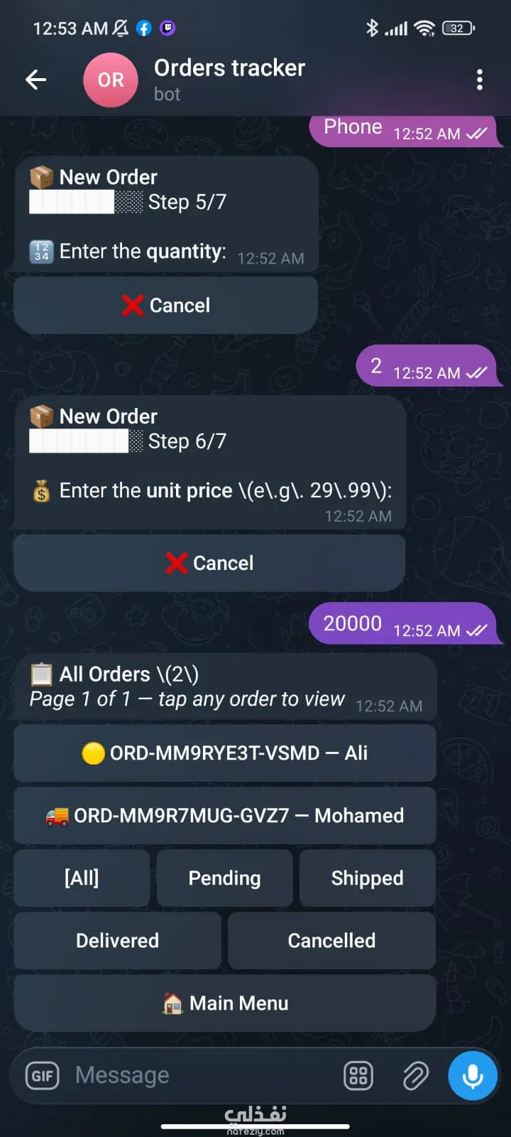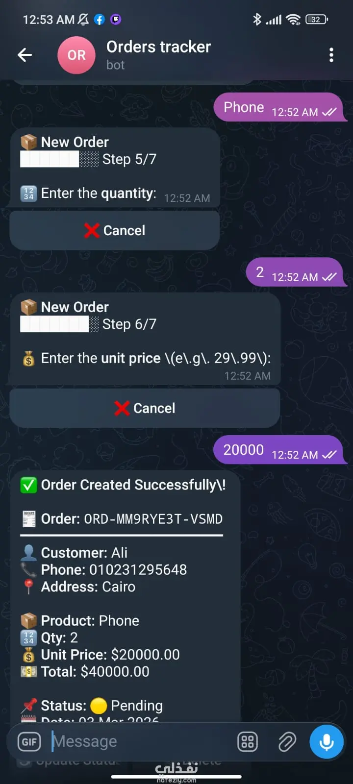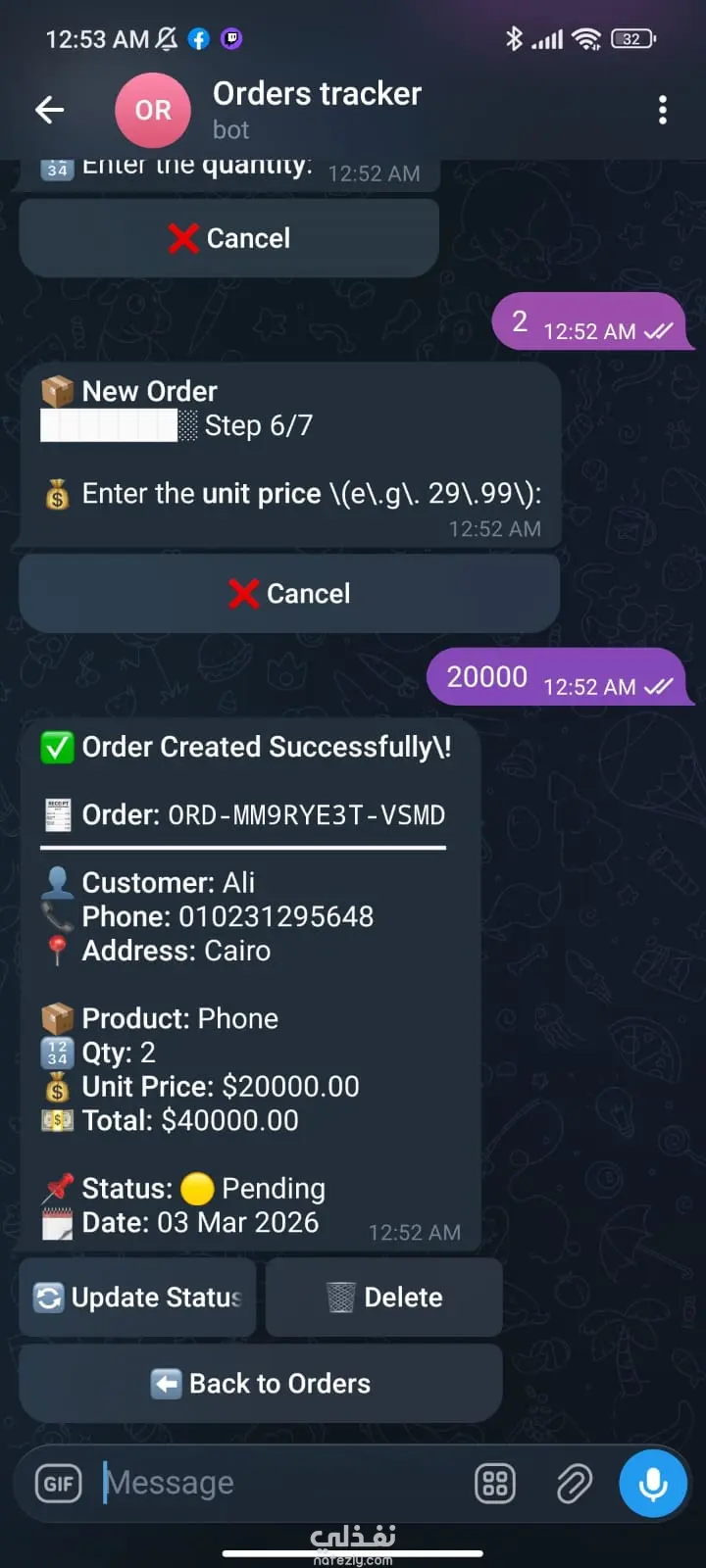 قمت بتطوير بوت على Telegram مخصص لأصحاب المتاجر وبائعي Instagram ليساعدهم على إدارة طلبات العملاء بطريقة سهلة ومنظمة دون الحاجة لاستخدام جداول أو تسجيل الطلبات يدويًا. فكرة المشروع: الكثير من بائعي إنستجرام يواجهون صعوبة في متابعة الطلبات داخل المحادثات أو عبر الملاحظات، لذلك يوفر هذا البوت نظامًا ذكيًا لإدارة الطلبات ومتابعتها بشكل احترافي من مكان واحد. مميزات البوت: 1- تسجيل الطلبات بسهولة إضافة طلب جديد مع بيانات العميل والمنتج مباشرة داخل البوت. 2- إدارة ومتابعة الطلبات عرض جميع الطلبات مع إمكانية تحديث حالة الطلب مثل: (جديد – قيد التجهيز – تم الشحن – تم التسليم). 3- تنظيم البيانات حفظ الطلبات بشكل منظم لسهولة الرجوع إليها في أي وقت. 4- حساب الأرباح إمكانية متابعة الأرباح والإيرادات الناتجة عن الطلبات. 5- واجهة سهلة الاستخدام تصميم بسيط وسريع يساعد البائع على إدارة متجره بدون تعقيد. 6- مناسب لمتاجر السوشيال ميديا مثالي لبائعي Instagram الذين يتعاملون مع عدد كبير من الطلبات يوميًا. الهدف من البوت هو توفير الوقت، تنظيم الطلبات، وتحسين إدارة المبيعات لبائعي إنستجرام.