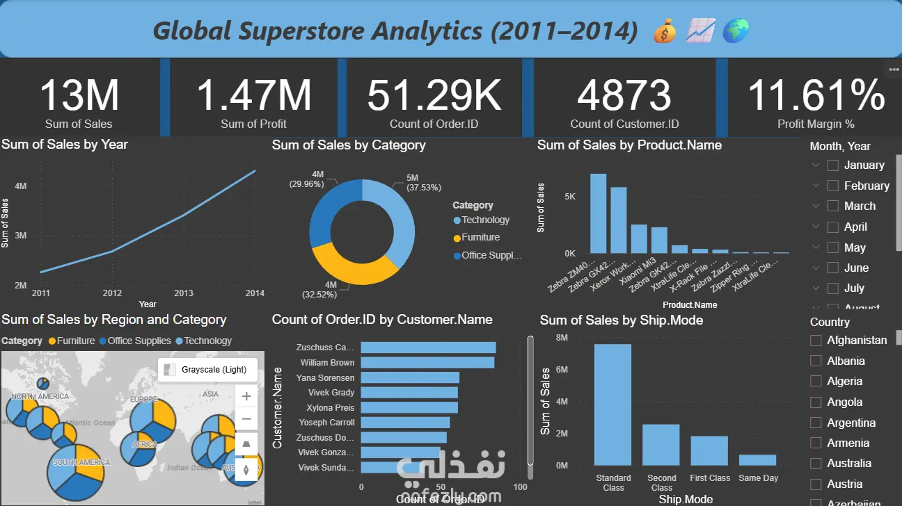 توفير فلاتر ذكية (Slicers) لتحليل البيانات حسب الدولة، التاريخ، وطريقة الشحن.