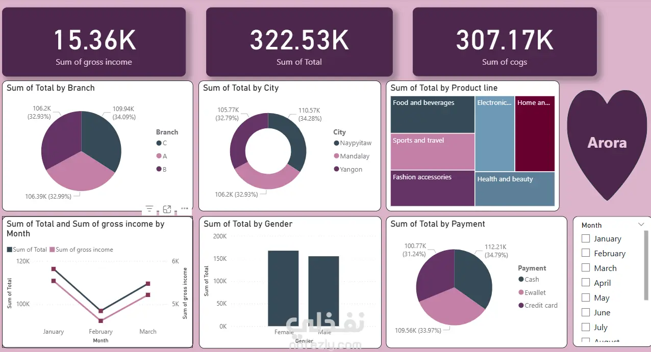 توزيع المبيعات حسب المدن (Mandalay, Yangon, Naypyitaw) وفروع المؤسسة.