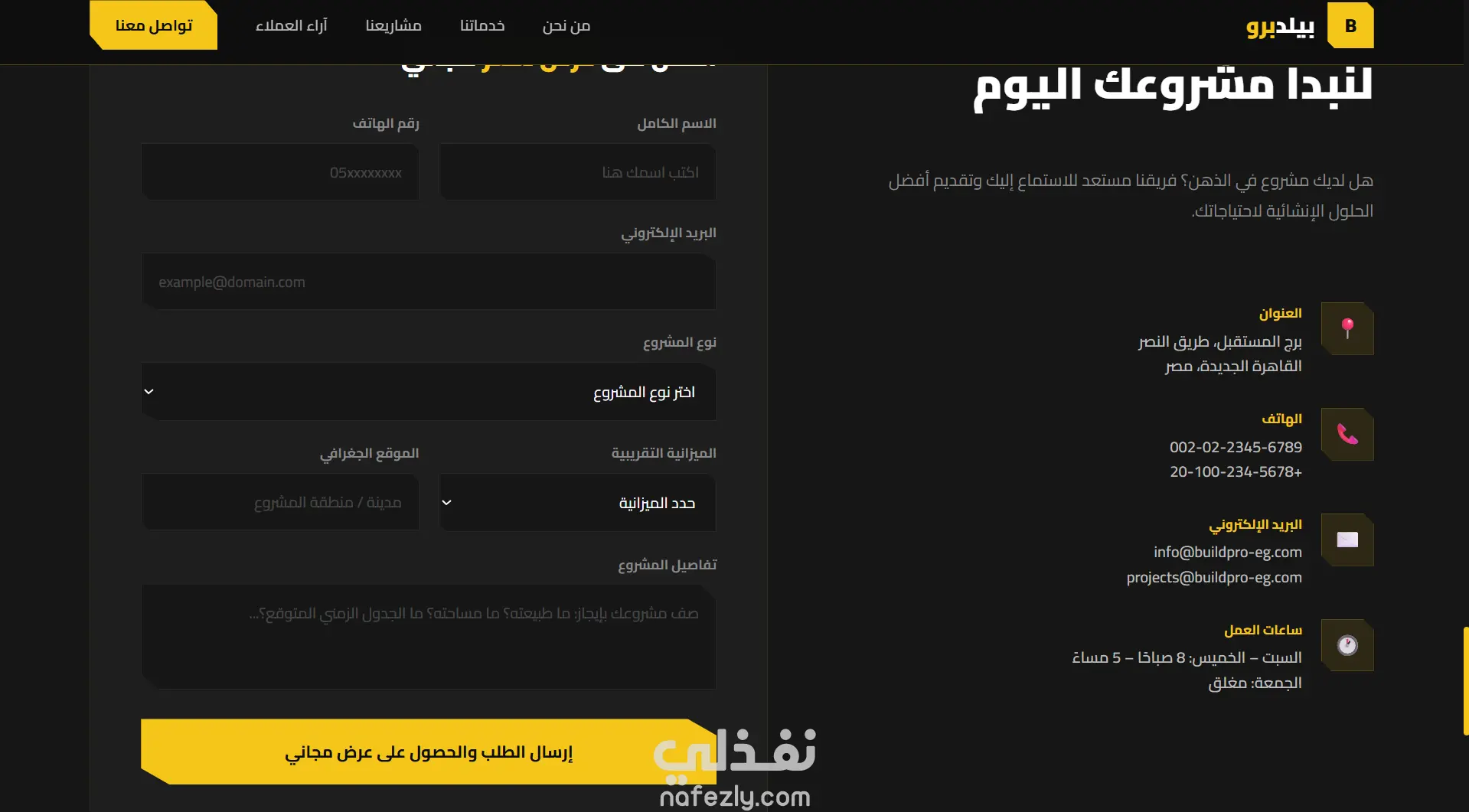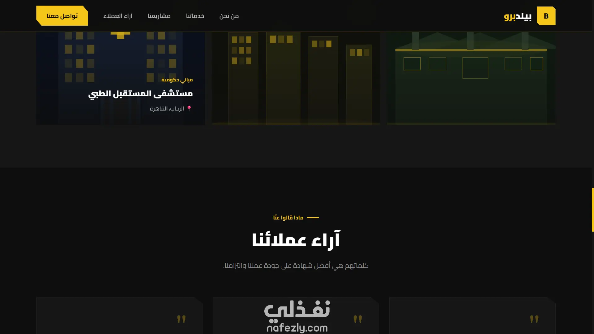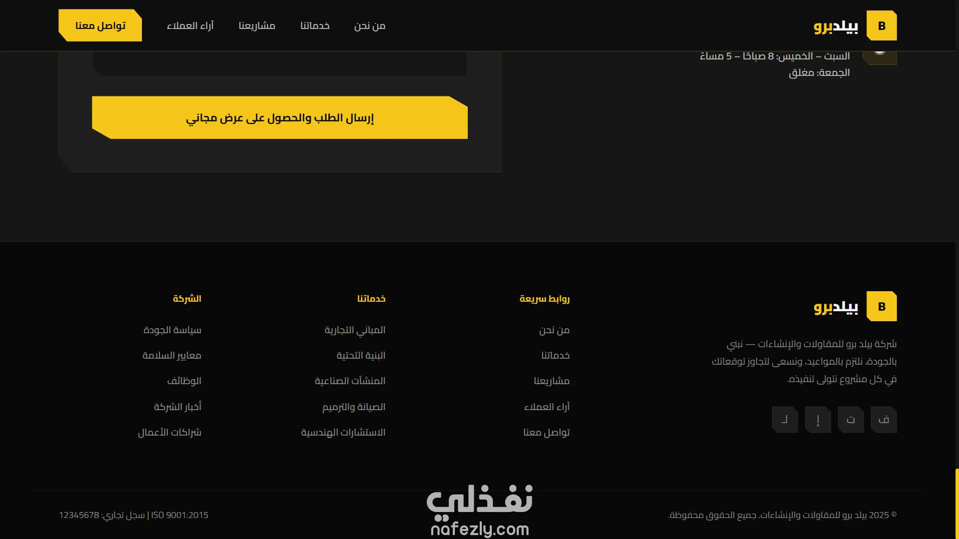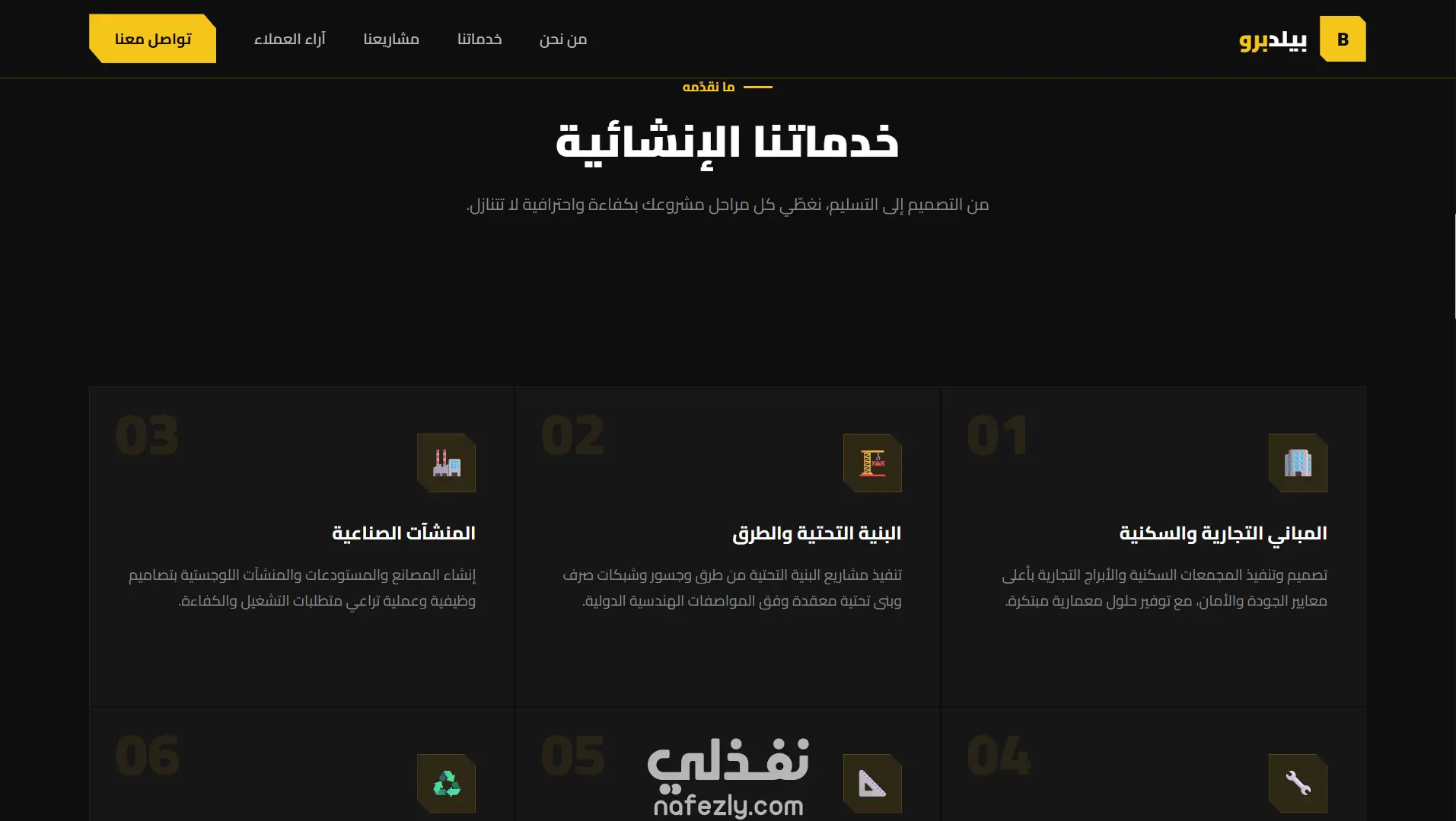 مشروع تصميم وتطوير موقع إلكتروني متكامل لشركة مقاولات وخدمات إنشائية، بهوية بصرية جريئة تعتمد على الألوان الداكنة مع لمسات صفراء ذهبية تعكس الطابع الصناعي الاحترافي. تم تنفيذ التصميم بأسلوب هندسي مميز باستخدام تقنيات قص الحواف (Clip-path) لإضفاء طابع معماري قوي يعكس طبيعة المجال.