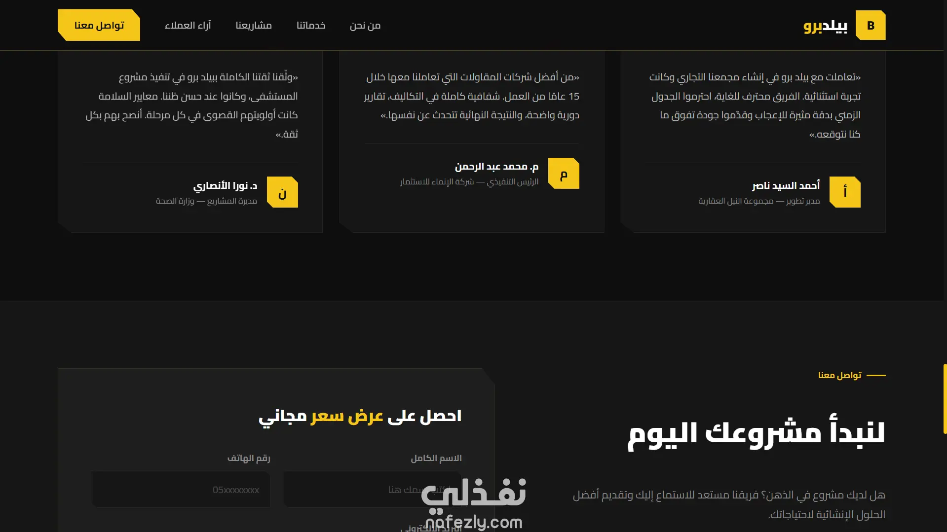 يتضمن الموقع أيضًا قسم آراء العملاء بثلاث بطاقات مراجعة تحمل أسماء عربية وأدوار مهنية واقعية لتعزيز المصداقية، إضافةً إلى نموذج تواصل احترافي يتيح اختيار نوع المشروع وتحديد نطاق الميزانية بالجنيه المصري، مما يجعله مناسبًا للتطبيق الفعلي في السوق المحلي.