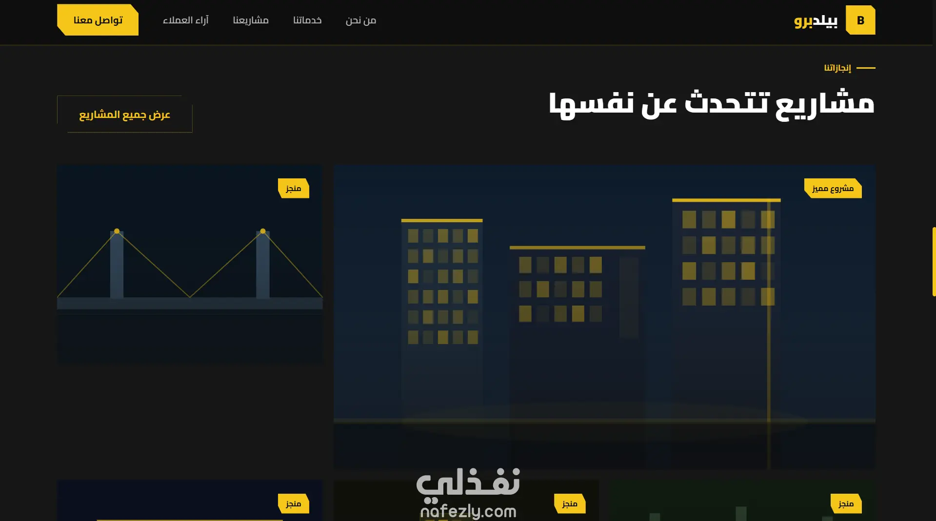 في قسم المشاريع، تم عرض خمسة نماذج أعمال متنوعة باستخدام مشاهد SVG واقعية (أبراج ليلية، جسر، مصنع، مجمع سكني، مستشفى)، مع تأثيرات بصرية عند التفاعل توضح تفاصيل كل مشروع بطريقة جذابة.