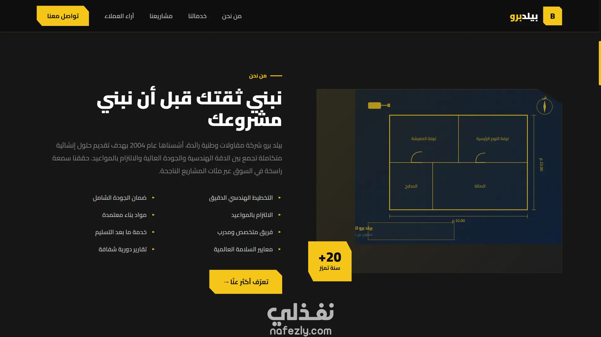 يحتوي الموقع على قسم "من نحن" مدعوم برسوم مخططات هندسية (Blueprint) باللغة العربية مع نقاط تمييز توضح خبرات الشركة وقيمها الأساسية. كما تم تصميم قسم الخدمات في شبكة منظمة تضم ست خدمات رئيسية، مع أرقام بارزة وتأثيرات تفاعلية عند التحويم تعزز تجربة المستخدم.