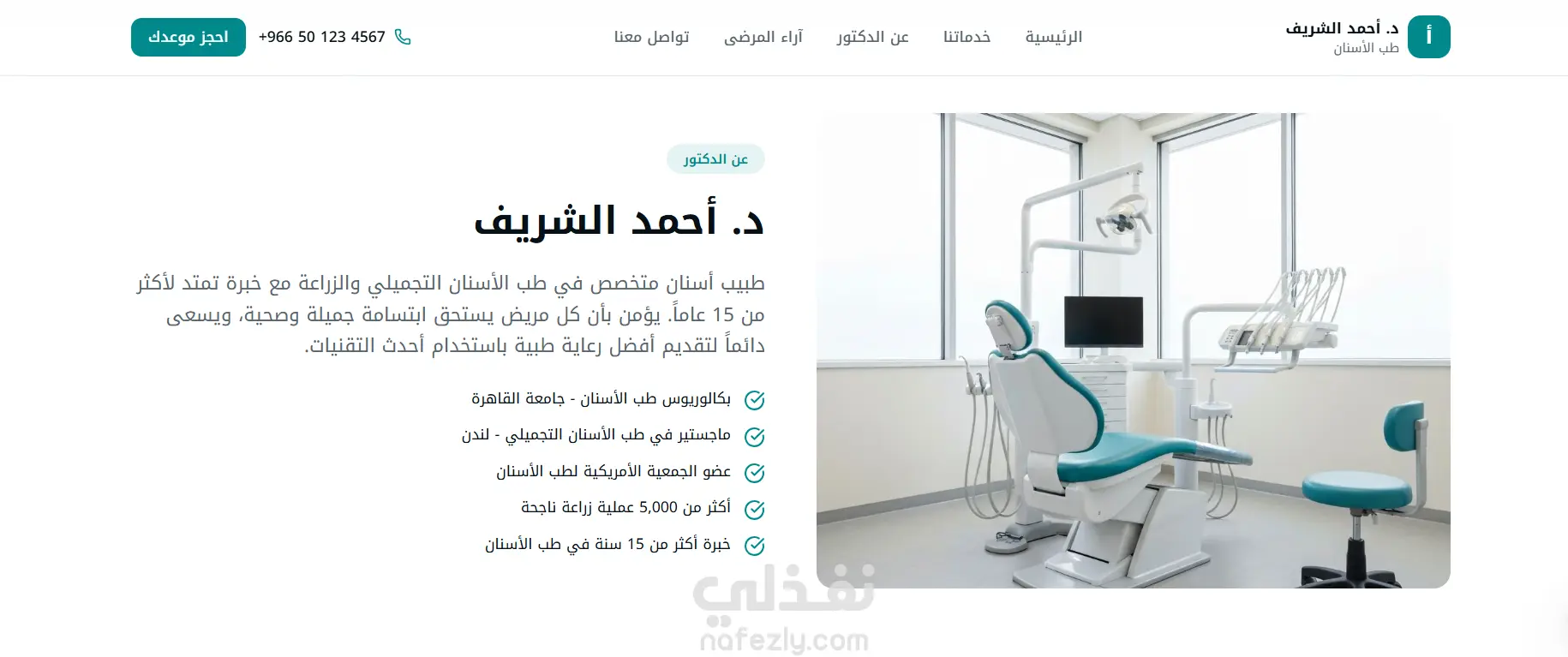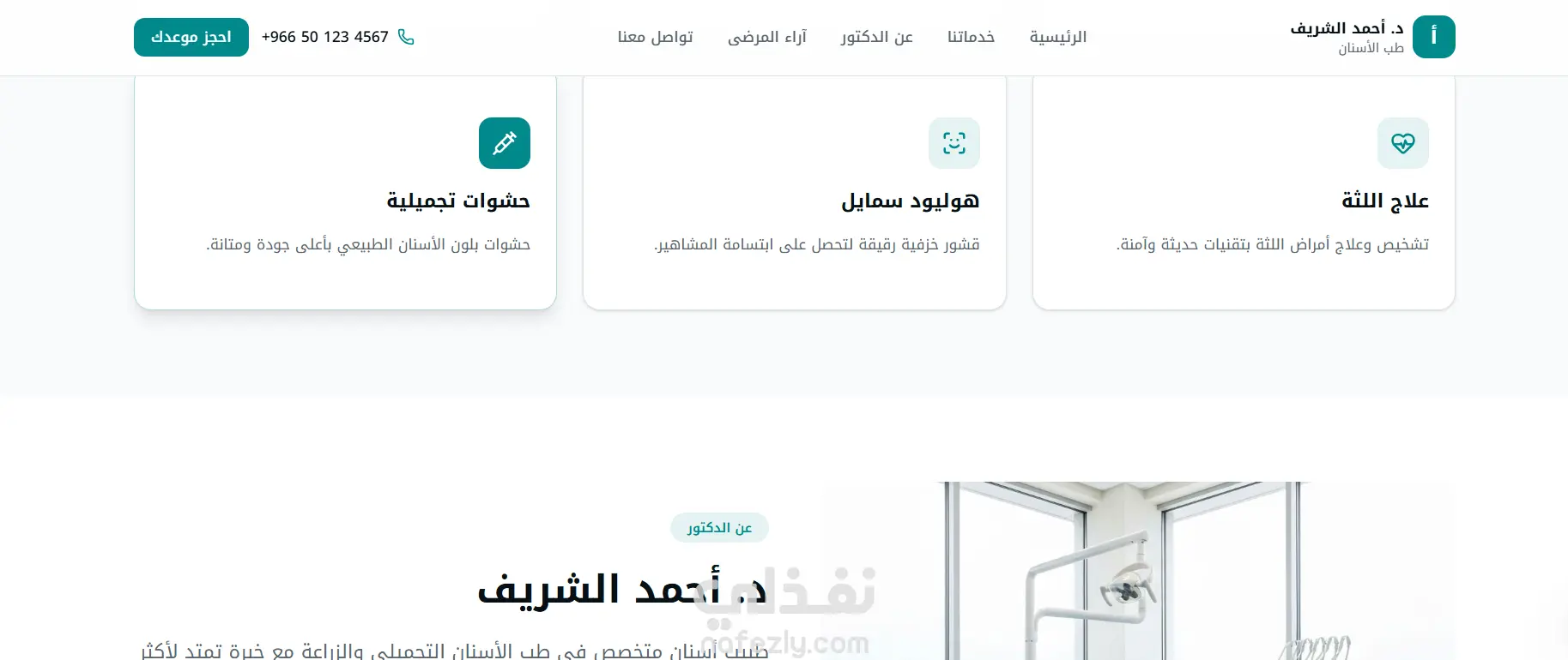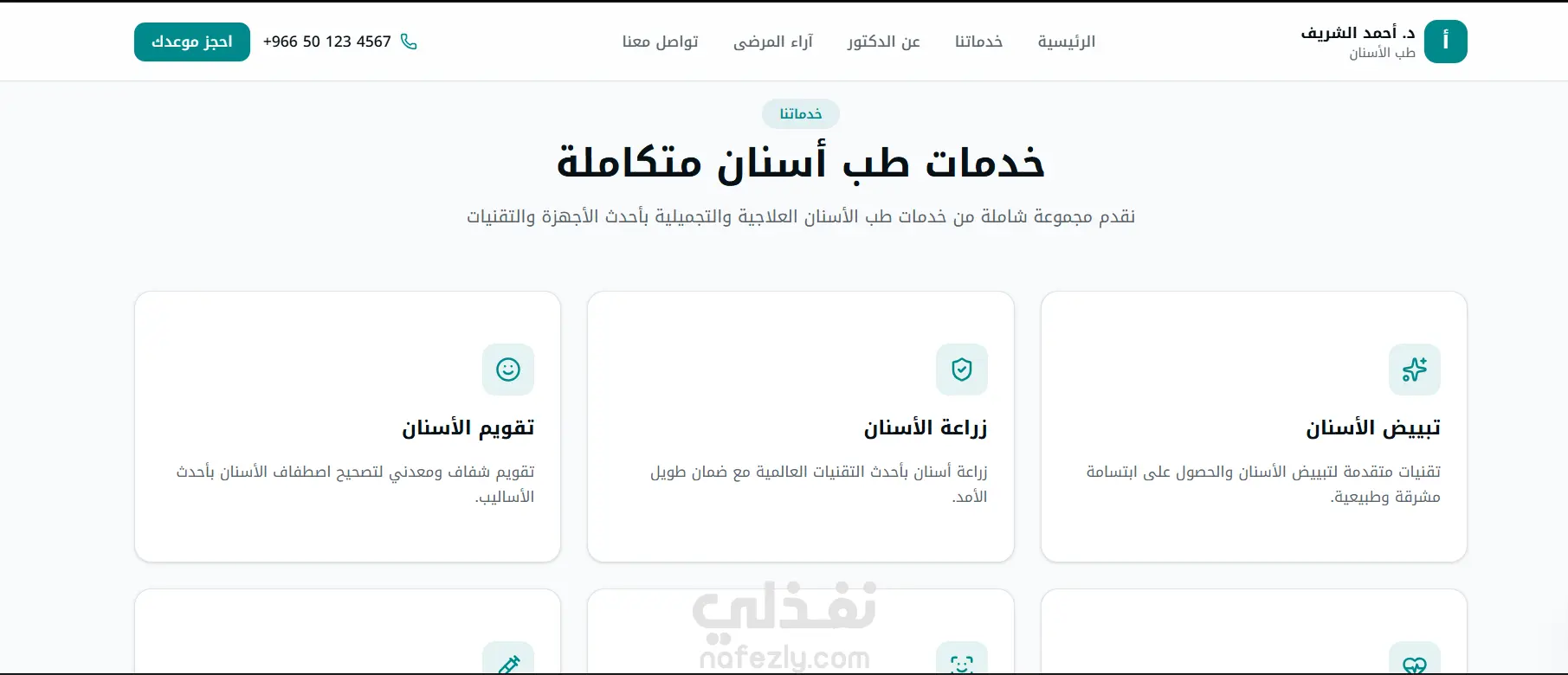 صفحة رئيسية توضح الخدمات المقدمة (تنظيف، تبييض، تقويم، زراعة أسنان…)