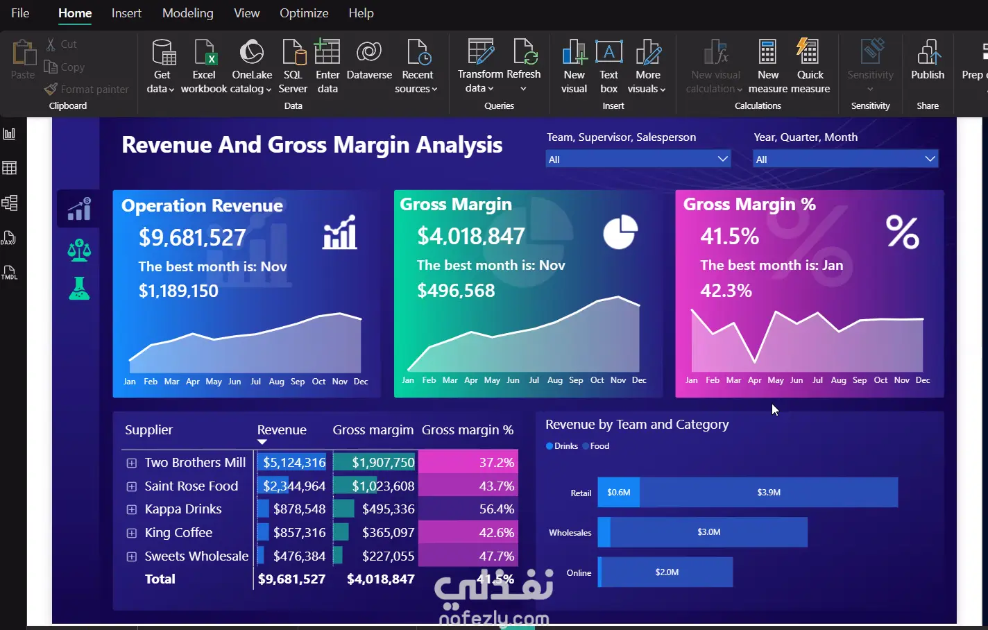 تصميم لوحات تحكم Power BI تفاعلية وذكية لتحليل البيانات المالية والأرباح بدقة واحترافية عالية.