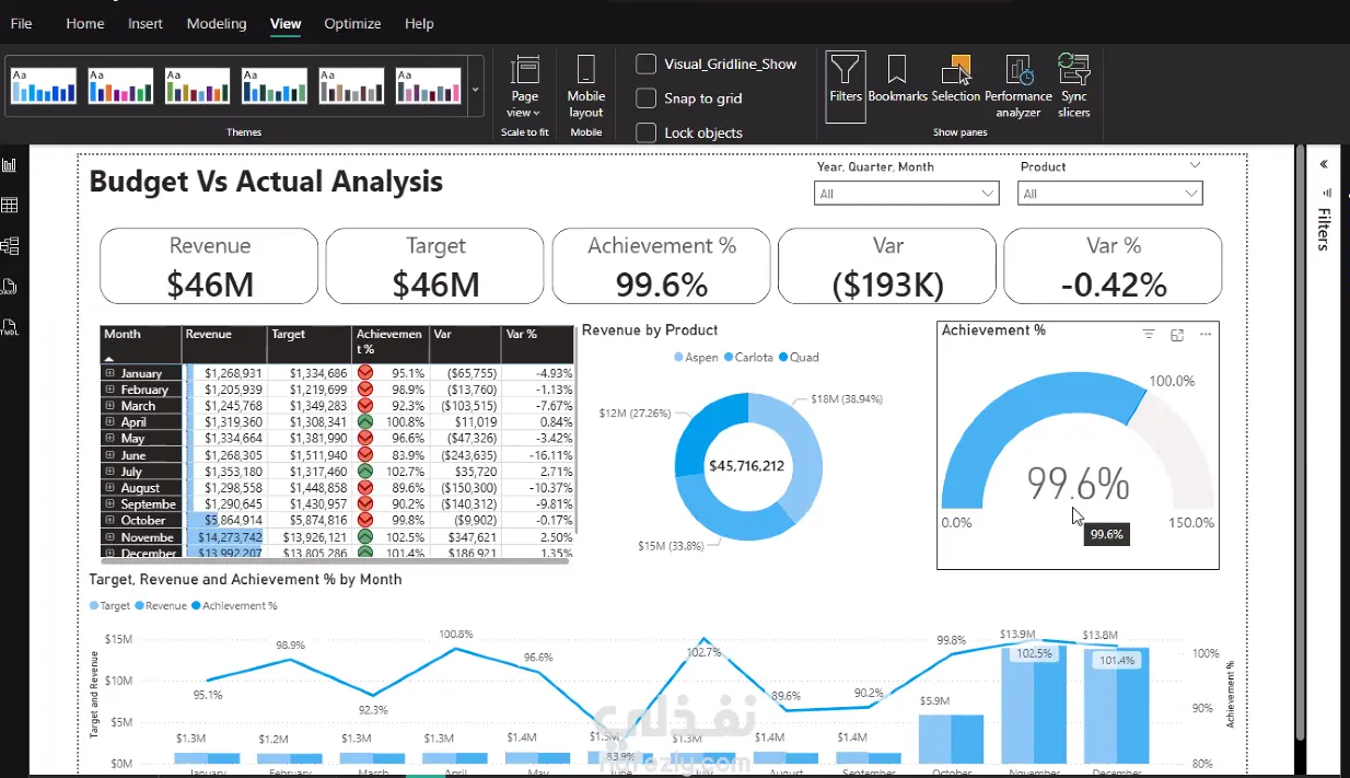 لوحة تحكم ذكية لتحليل الميزانية التقديرية مقابل الأداء الفعلي