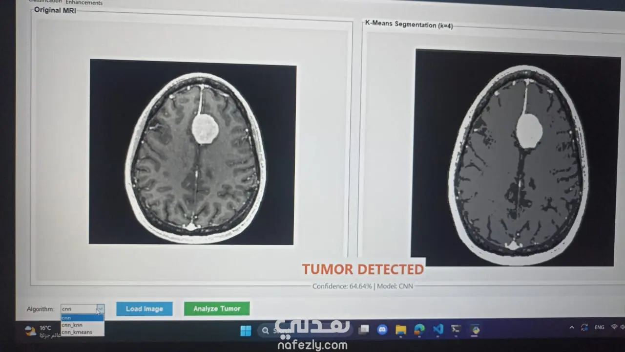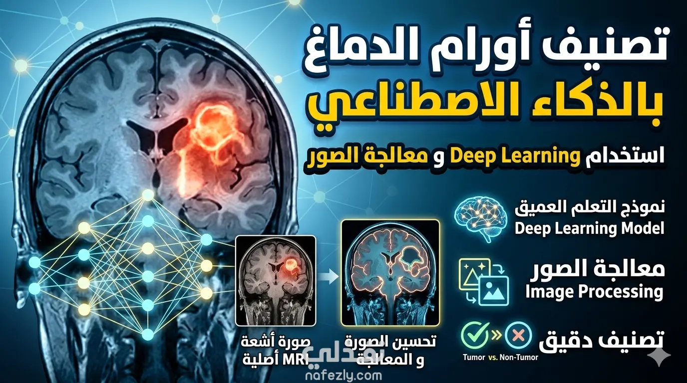 في هذا المشروع قمت بتطوير نموذج ذكاء اصطناعي لتصنيف أورام الدماغ اعتمادًا على صور الرنين المغناطيسي (MRI)، بهدف المساعدة في تحليل الصور الطبية واكتشاف الأنماط المرتبطة بالأورام. يتضمن المشروع عدة مراحل لمعالجة الصور وتحليلها: تحسين جودة الصور الطبية باستخدام تقنيات تحسين الصور لزيادة وضوح التفاصيل. استخراج الخصائص (Feature Extraction) باستخدام شبكة عصبية تلافيفية (CNN) لاستخراج أهم السمات من الصور. تجزئة الصور (Image Segmentation) باستخدام خوارزمية K-Means لتحديد المناطق المهمة داخل الصورة. تصنيف الصور باستخدام خوارزمية K-Nearest Neighbors (KNN) لتحديد نوع الورم أو التمييز بين الصور. الهدف من المشروع هو بناء نموذج قادر على تحليل الصور الطبية بدقة عالية والمساعدة في دعم التحليل الطبي باستخدام تقنيات التعلم الآلي والرؤية الحاسوبية. الأدوات والتقنيات المستخدمة: Python Deep Learning (CNN) Computer Vision KNN Algorithm K-Means Clustering Image Processing Libraries: PyTorch / OpenCV / Scikit-learn نتيجة المشروع: نموذج قادر على معالجة الصور الطبية، استخراج الخصائص المهمة منها، وتصنيف صور أورام الدماغ بدقة جيدة.
