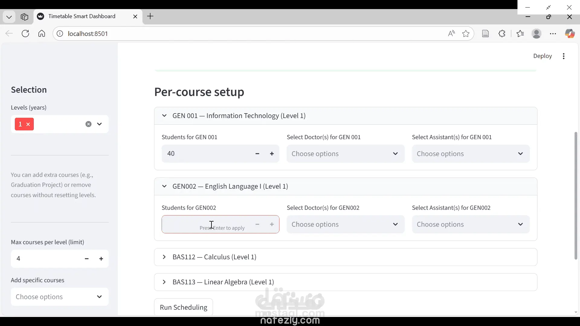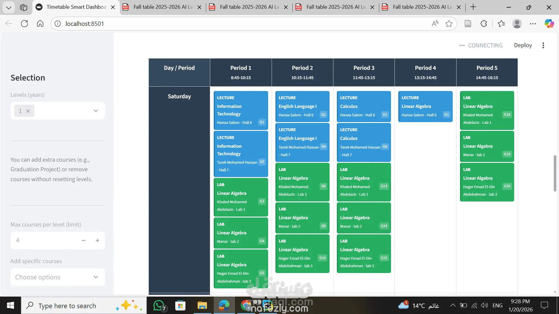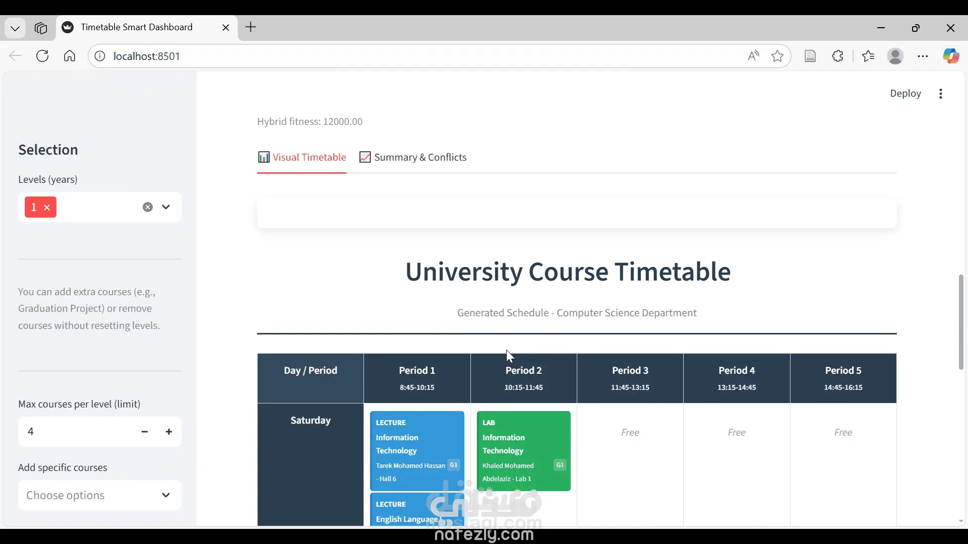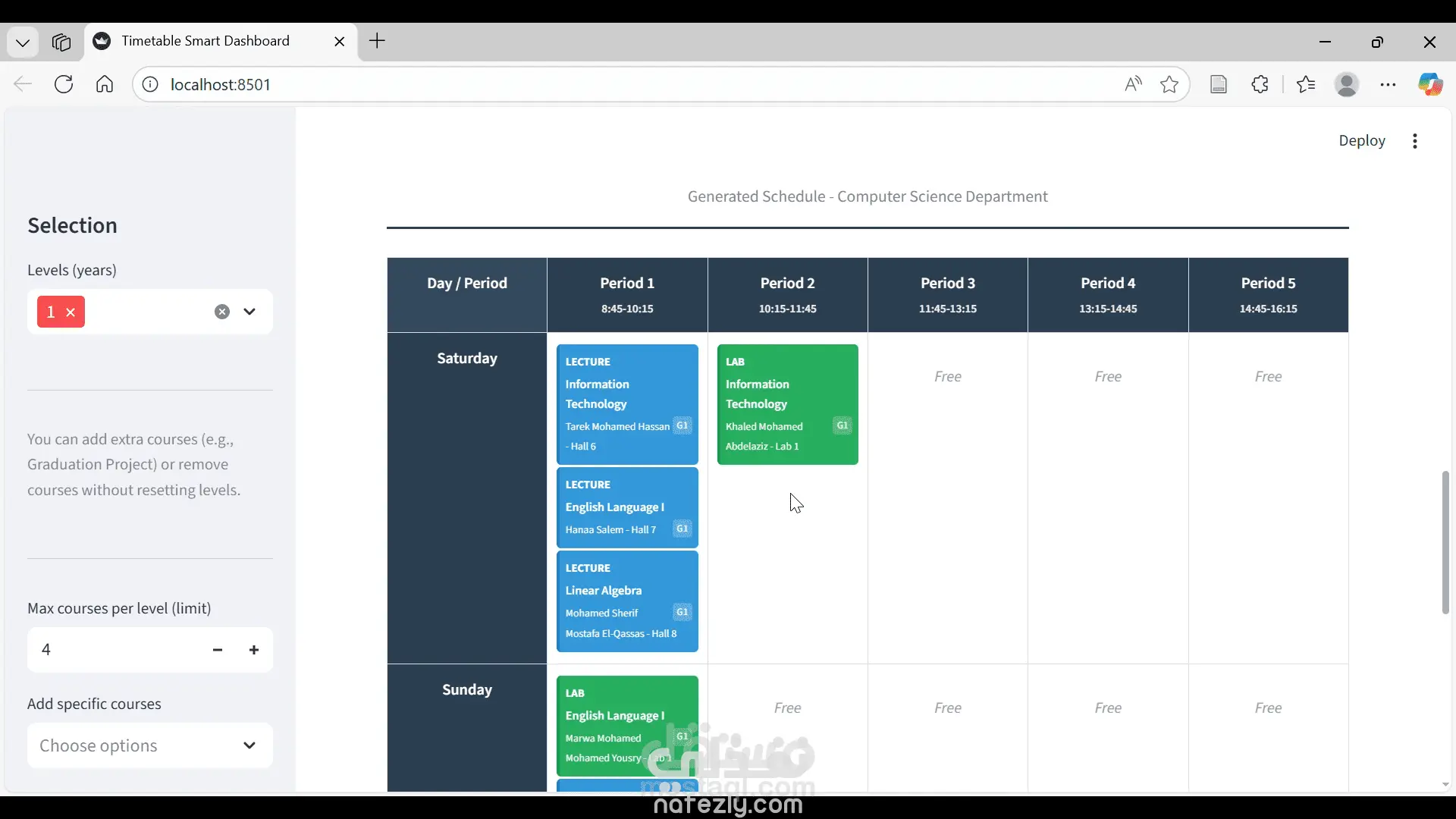 Automatic generation of weekly timetables (Saturday–Thursday).