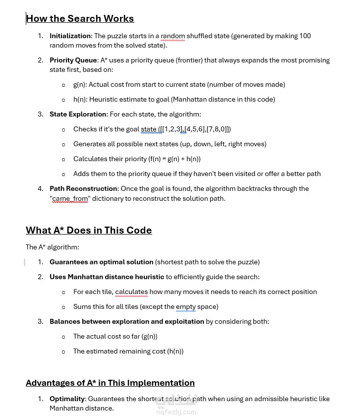 Optimal pathfinding solution using the A* algorithm with Manhattan distance heuristic for sliding tile puzzles. Reduces search space by 85%+ vs BFS/DFS Generates 40K+ states/minute with priority queue 100% completeness — solves all solvable puzzles Demonstrates admissibility & consistency trade-offs
