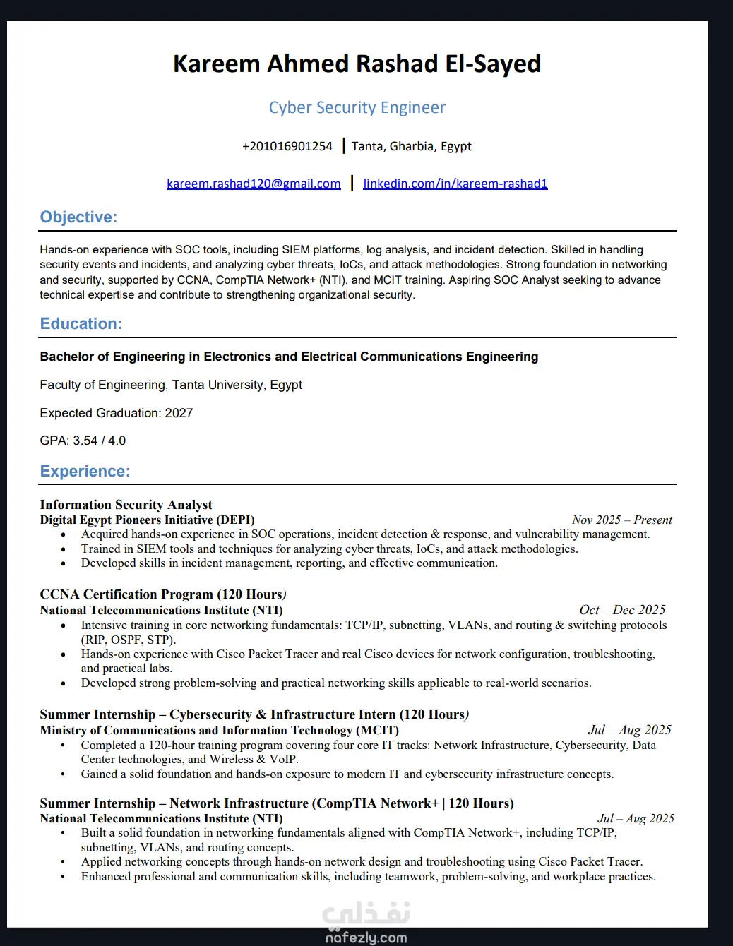قمت بتصميم سيرة ذاتية احترافية ومنظمة تساعد على عرض المهارات والخبرات بشكل واضح وجذاب. أركز في التصميم على البساطة والترتيب الجيد للمعلومات حتى يسهل على مسؤولي التوظيف قراءة السيرة الذاتية بسرعة. كما أحرص على تنسيق الأقسام مثل المهارات، الخبرات، التعليم وبيانات التواصل بطريقة احترافية تناسب مختلف المجالات.