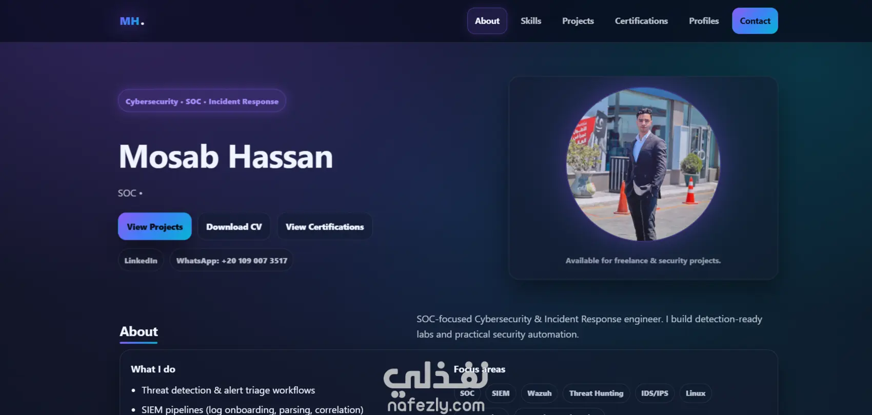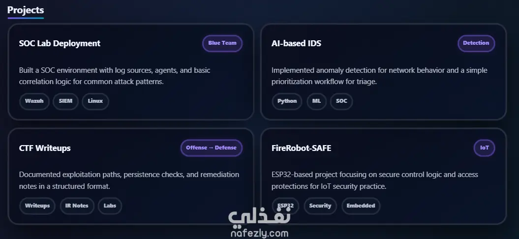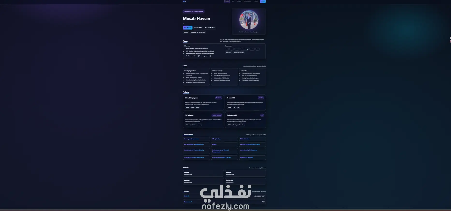 قمت بتصميم وبرمجة موقع Portfolio شخصي احترافي لعرض الأعمال والخبرات والمهارات بطريقة منظمة وجذابة. الموقع تم تطويره باستخدام HTML وCSS وJavaScript مع تصميم عصري متجاوب يعمل على جميع الأجهزة مثل الهواتف والكمبيوتر. يحتوي الموقع على عدة أقسام رئيسية مثل: الصفحة الرئيسية قسم نبذة عني قسم المهارات قسم المشاريع قسم الشهادات قسم التواصل وروابط الحسابات تم تصميم الموقع بكود نظيف وسريع التحميل ليكون مناسبًا للنشر على الإنترنت باستخدام استضافات مثل Netlify أو GitHub Pages. الهدف من الموقع هو مساعدة المستقلين والمبرمجين على عرض أعمالهم وخبراتهم بشكل احترافي أمام العملاء.