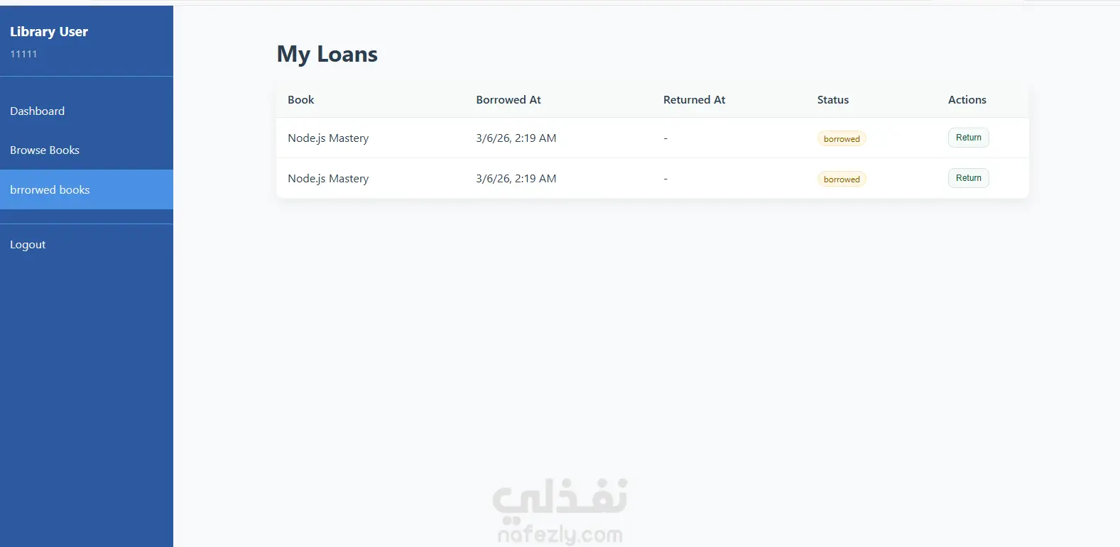 نظام ويب لإدارة المكتبات يتيح تنظيم الكتب والمستخدمين وعمليات الاستعارة بسهولة. تم تطوير المشروع باستخدام Angular لبناء واجهة المستخدم التفاعلية، و Express.js مع Node.js لإنشاء الـ API، بينما تم استخدام MongoDB لتخزين البيانات. يوفر النظام المميزات التالية: إضافة وتعديل وحذف الكتب تسجيل المستخدمين وإدارة الحسابات استعارة الكتب وإرجاعها عرض حالة الكتب (متاحة / غير متاحة) لوحة تحكم للإدارة لمتابعة عمليات المكتبة هذا المشروع يوضح مهارات تطوير تطبيقات الويب الكاملة (Full Stack Development) باستخدام تقنيات حديثة