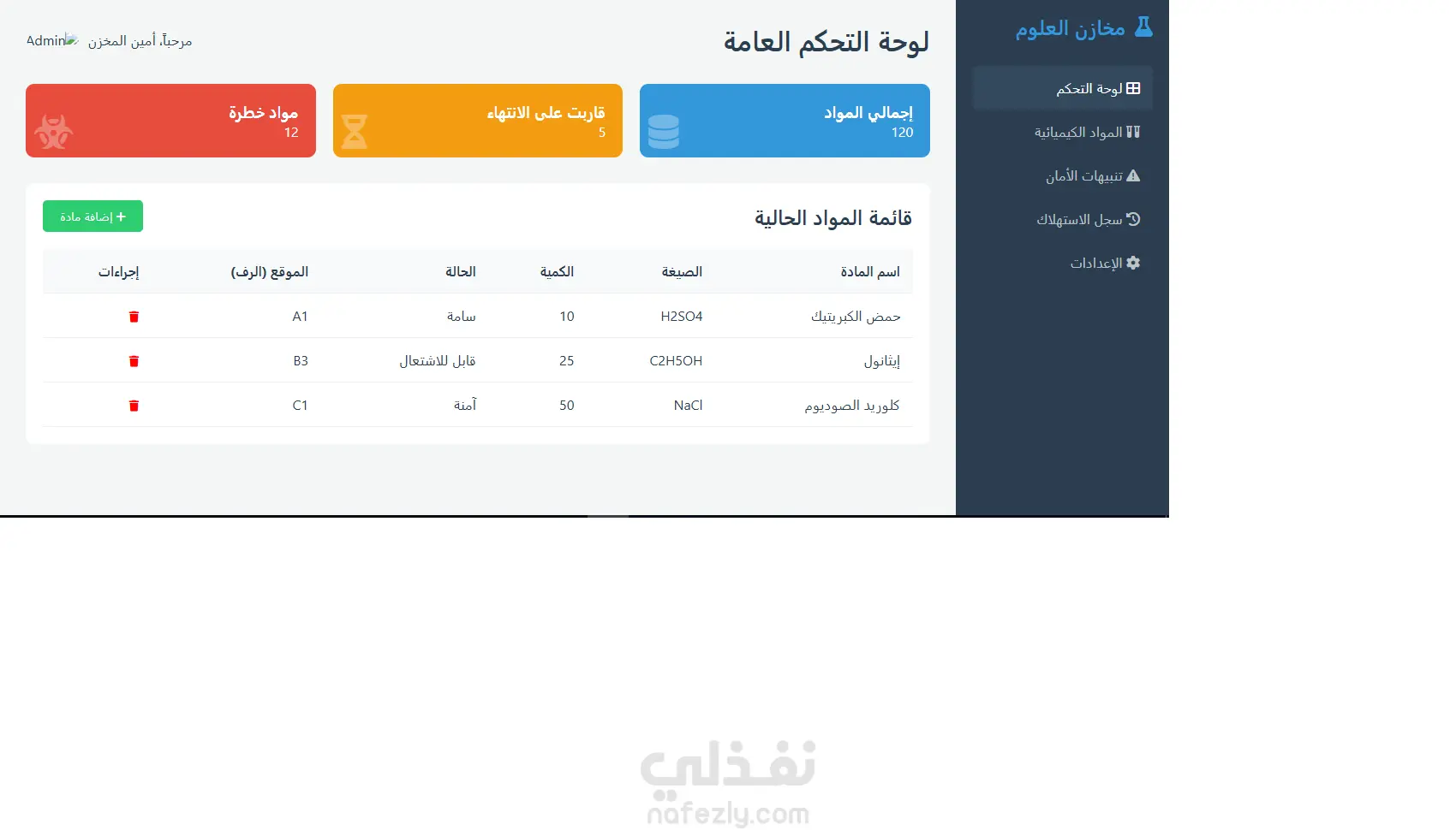 إدارة المخاطر: تمييز المواد حسب درجة الخطورة (قابل للاشتعال، سام، آمن) باستخدام أيقونات وألوان تنبيهية.