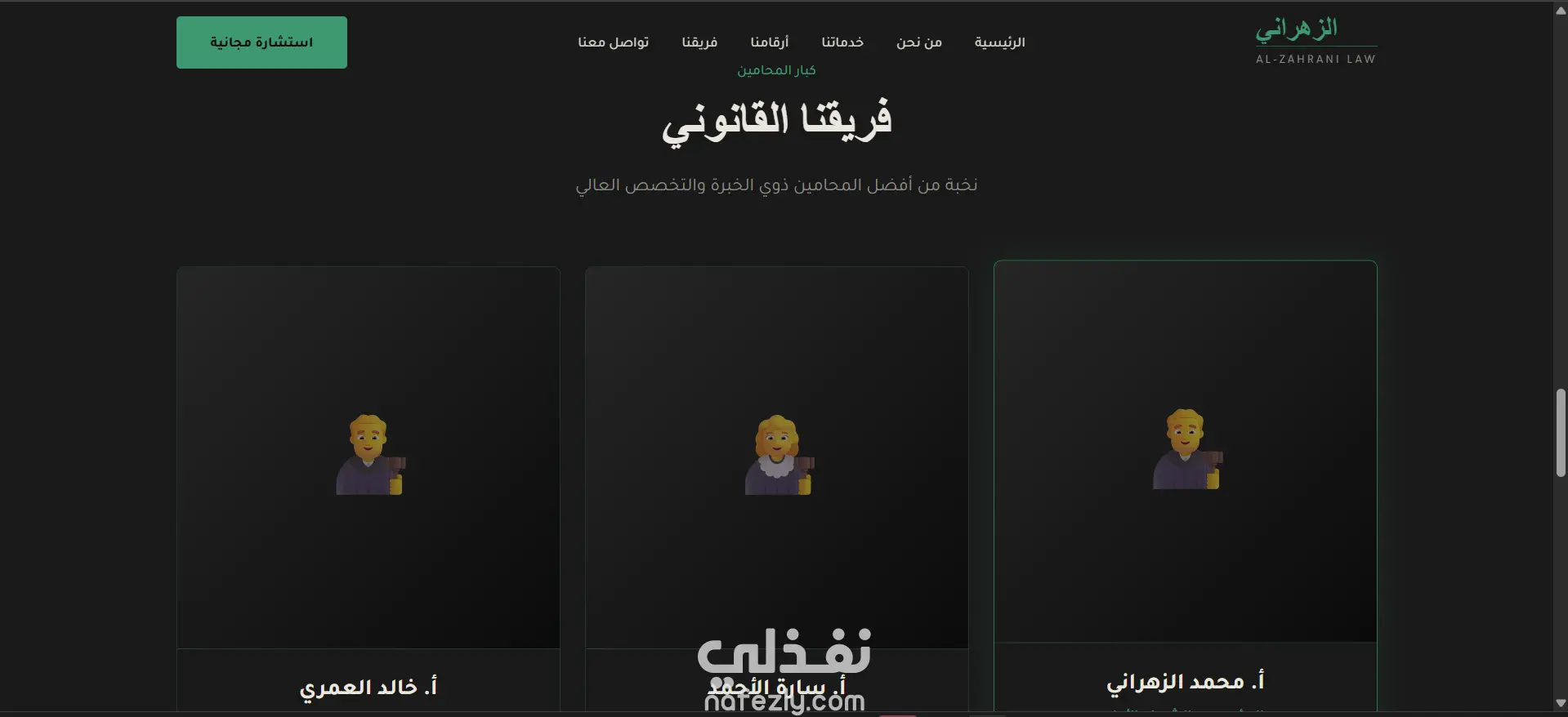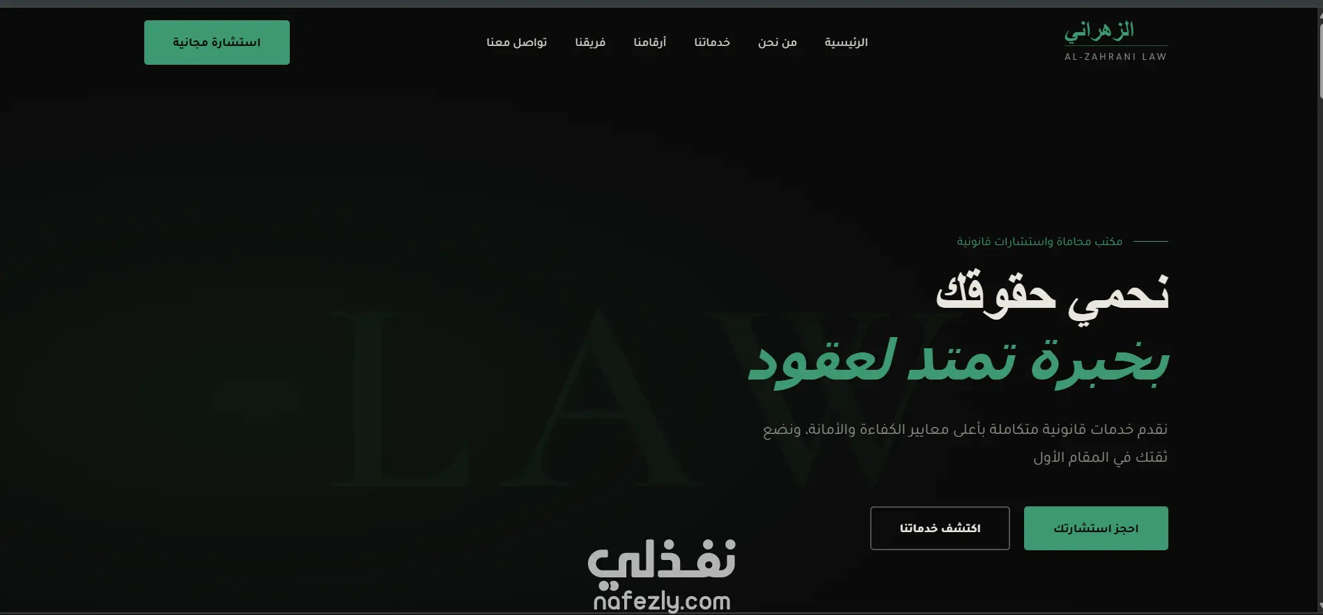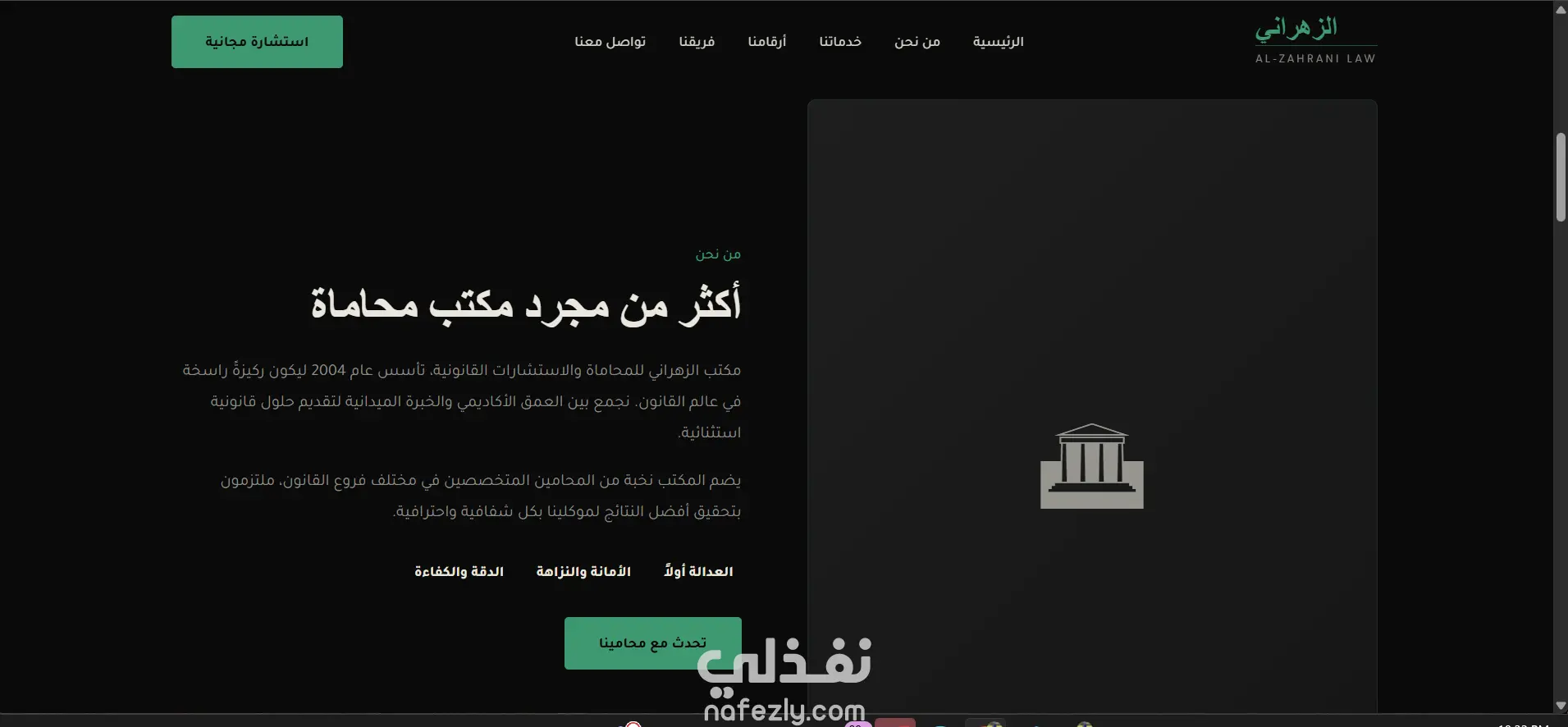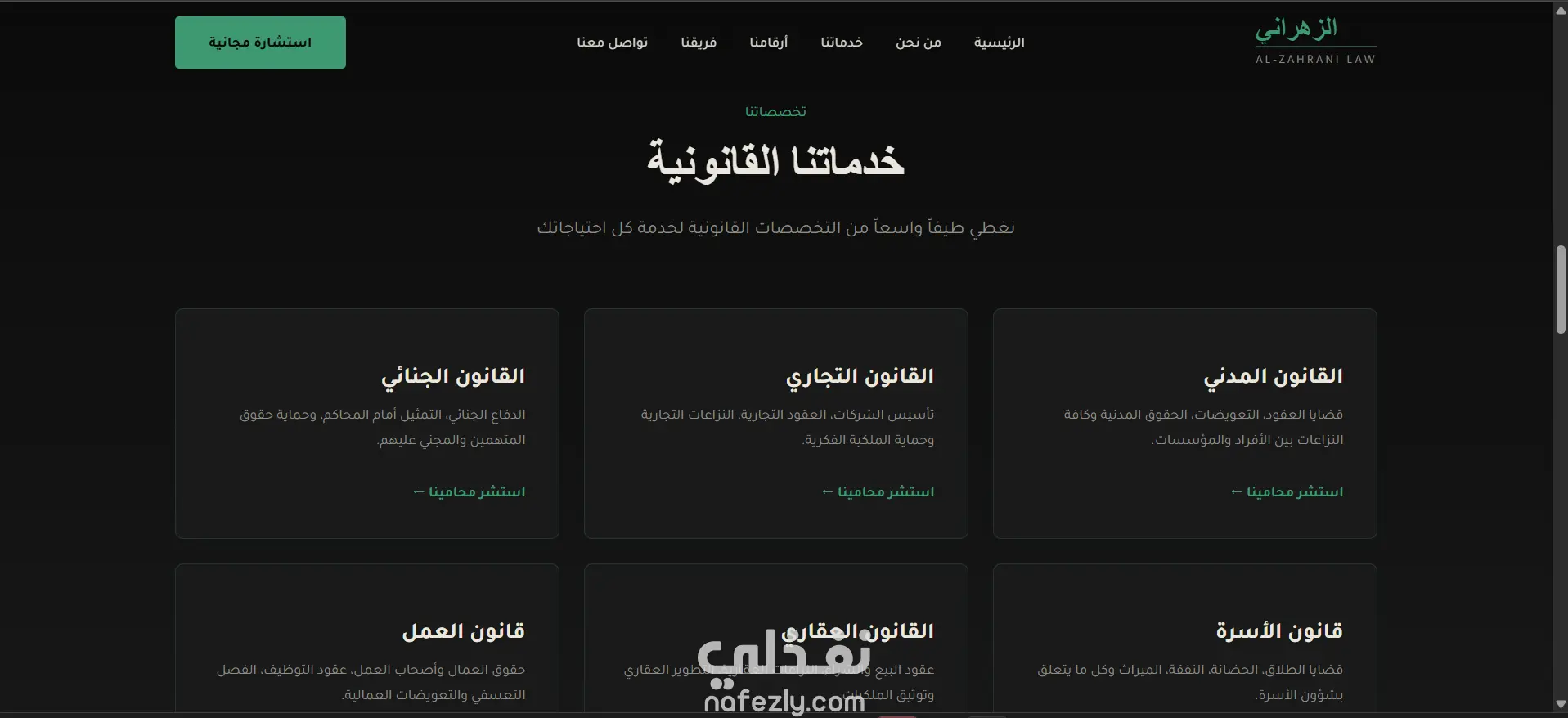 تصميم وتطوير موقع احترافي لمكتب محاماة واستشارات قانونية بتصميم عصري يعكس الطابع الرسمي للمجال القانوني. الموقع متجاوب مع جميع الأجهزة ويدعم اللغة العربية واتجاه RTL.
