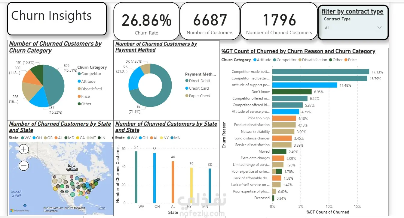 تم إنشاء لوحة معلومات تحليلية لفهم سلوك العملاء وتحليل أسباب تسرب العملاء (Customer Churn) بهدف مساعدة الشركات على تحديد العوامل التي تؤدي إلى فقدان العملاء وتحسين استراتيجيات الاحتفاظ بهم. تعرض اللوحة مؤشرات رئيسية مثل معدل تسرب العملاء، العدد الإجمالي للعملاء، وعدد العملاء الذين توقفوا عن استخدام الخدمة. أهم التحليلات داخل اللوحة تحليل معدل تسرب العملاء وتوزيع العملاء الذين غادروا. تحديد الأسباب الرئيسية للتسرب مثل عروض المنافسين، عدم رضا العملاء عن الخدمة، وارتفاع الأسعار. تحليل تسرب العملاء حسب طريقة الدفع. دراسة التوزيع الجغرافي للعملاء الذين غادروا باستخدام الخريطة. تحليل تفصيلي لأسباب التسرب مثل جودة الخدمة، الأسعار، أو مشاكل الشبكة. Power BI تحليل البيانات ذكاء الأعمال (Business Intelligence) تصور البيانات تحليل سلوك العملاء (Customer Analytics) تصميم لوحات المعلومات