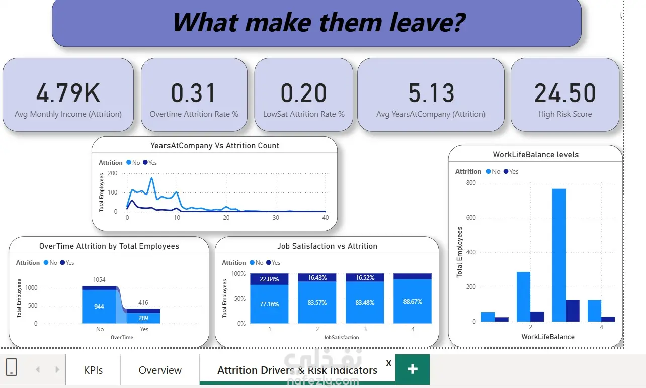 تم تصميم لوحة معلومات تفاعلية لتحليل ظاهرة ترك الموظفين للعمل (Employee Attrition) بهدف تحديد العوامل الرئيسية التي تؤثر على قرار الموظفين بترك الشركة. تعرض اللوحة مجموعة من المؤشرات الرئيسية (KPIs) مثل متوسط الدخل الشهري للموظفين الذين تركوا العمل، معدل ترك العمل بين الموظفين الذين يعملون ساعات إضافية، ومتوسط عدد السنوات التي يقضيها الموظف في الشركة قبل تركها. أهم التحليلات داخل اللوحة تحليل العلاقة بين العمل الإضافي (Overtime) ومعدل ترك الموظفين. دراسة تأثير مستوى الرضا الوظيفي (Job Satisfaction) على قرار ترك العمل. تحليل عدد سنوات العمل في الشركة لمعرفة الفترات التي يزداد فيها احتمال ترك الموظفين. دراسة تأثير التوازن بين الحياة والعمل (Work-Life Balance) على بقاء الموظفين في الشركة. تحديد المؤشرات التي تشير إلى ارتفاع خطر ترك الموظفين. الأدوات والمهارات المستخدمة Power BI تحليل البيانات تصميم لوحات المعلومات (Dashboard Design) تحليل الموارد البشرية (HR Analytics) تصميم مؤشرات الأداء (KPIs) تصور البيانات (Data Visualization)