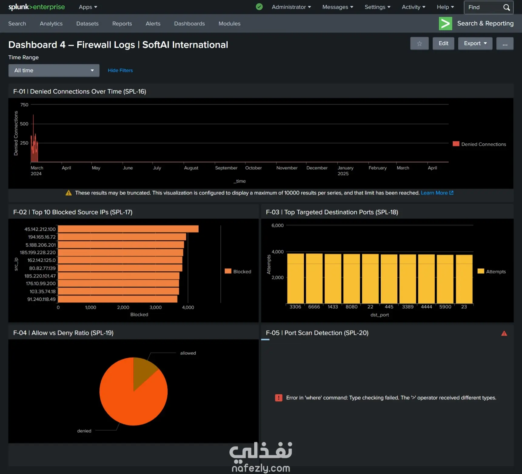 Deployed a full Splunk Enterprise SIEM solution for SoftAI International covering 5 log sources 85,885 events, and a 7-day active monitoring window. **What I Did** - Designed and ingested 5 log datasets into dedicated Splunk indexes: Windows Security, Linux Authentication, Apache Web Access, Cisco Firewall, and Application Performance. - Wrote 25 SPL queries using timechart, stats, eval, rex, dc(), where, avg() covering the full detection lifecycle. - Built 5 interactive dashboards (25 panels total) with dark-theme SOC-style visualisations. - Deployed syslog-ng real-time TCP log forwarding between two Linux nodes with near-instantaneous delivery. - Configured automated Splunk alerting for SSH brute-force threshold breach detection. **Key Findings** - Detected a brute-force burst of ~350 failed Windows logons in an 8-second window on 4 March 2024 02:00. - Identified IP 45.142.212.100 scanning 506 unique destination ports with 4,333 total firewall attempts. - Linked the same threat actor IPs across Apache, Linux, and firewall logs using cross-dataset correlation. - Web reconnaissance confirmed against /phpMyAdmin/, /.env, and /wp-login.php from 2 external hosts. **Tools & Technologies** Splunk Enterprise, SPL, syslog-ng, Windows Event Logs, Linux auth.log, Apache access.log, Cisco ASA Firewall Logs, Application Performance Logs.