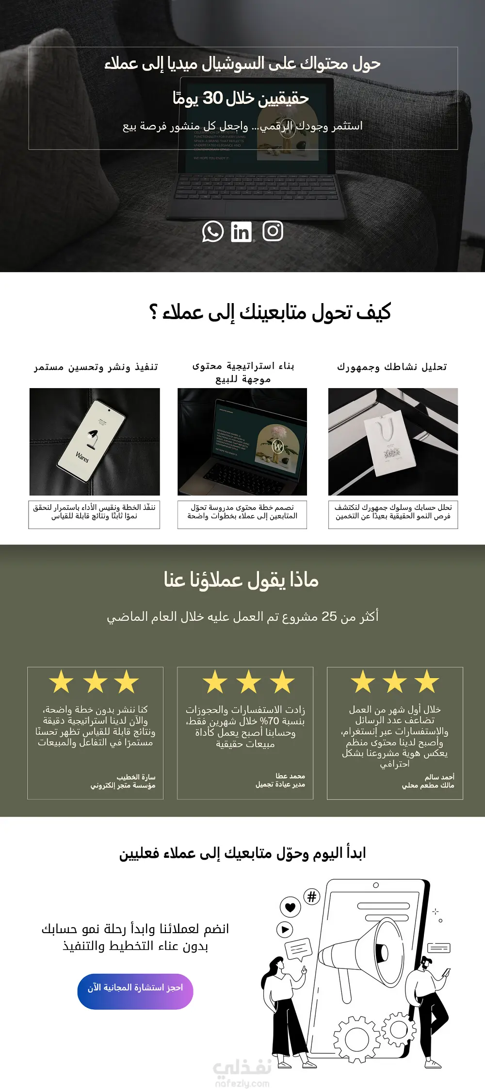 نماذج مختارة من أعمالي في كتابة محتوى صفحات الهبوط، حيث ركزت على صياغة نصوص جذابة ومقنعة تهدف إلى توجيه الزوار نحو التفاعل المطلوب، سواء كان ذلك بالاشتراك، أو الشراء، أو تنزيل المحتوى. تم تصميم كل نموذج بعناية ليجمع بين الوضوح، قوة الرسالة، وتحفيز القارئ، مع مراعاة أسلوب العلامة التجارية والجمهور المستهدف