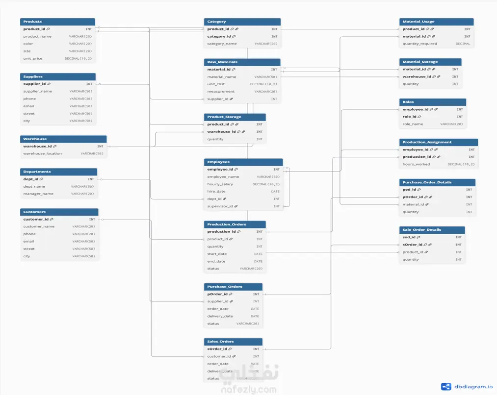 في هذا المشروع قمت بانشاء DataBase باستخدام MySQL لمصنع ملابس. تحتوي قاعدة علي بيانات تخص العمال, الخامات المستخدمة , الموردون ,الماكينات المستخدمة و المشترون. كما تحتوي ايضا علي علاقات بينهم.