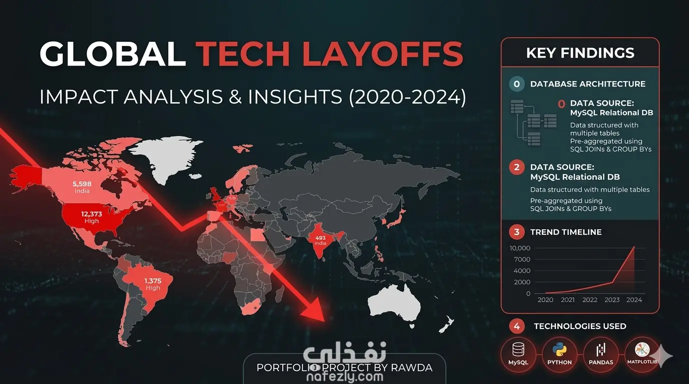 في هذا المشروع، قمت بتحليل بيانات تسريحات الموظفين في كبرى شركات التقنية العالمية لفهم الأنماط والاتجاهات التي أدت إلى هذه الأزمة. الهدف كان تحويل آلاف السجلات من البيانات الخام إلى رؤى بصرية واضحة تساعد المحللين وصناع القرار على فهم حجم التأثير وتوزيعه الجغرافي والقطاعي. الخطوات التي قمت بها: جمع وتنظيف البيانات (Data Cleaning): التعامل مع القيم المفقودة (Missing Values) وتوحيد تنسيق التواريخ وأسماء الشركات لضمان دقة النتائج. التحليل الاستكشافي (EDA): استخراج مؤشرات الأداء الرئيسية مثل: إجمالي عدد الموظفين المسرحين سنوياً. أكثر القطاعات تأثراً (مثل التمويل، البيع بالتجزئة، الرعاية الصحية). الدول والمدن التي شهدت أكبر عدد من التسريحات. هندسة البيانات: تصنيف الشركات بناءً على مرحلة التمويل (Series A, Post-IPO, etc) لمعرفة العلاقة بين استقرار الشركة وقرارات التسريح. الأدوات المستخدمة: MySQL لمعالجة البيانات.