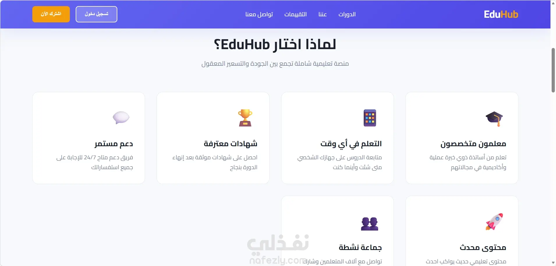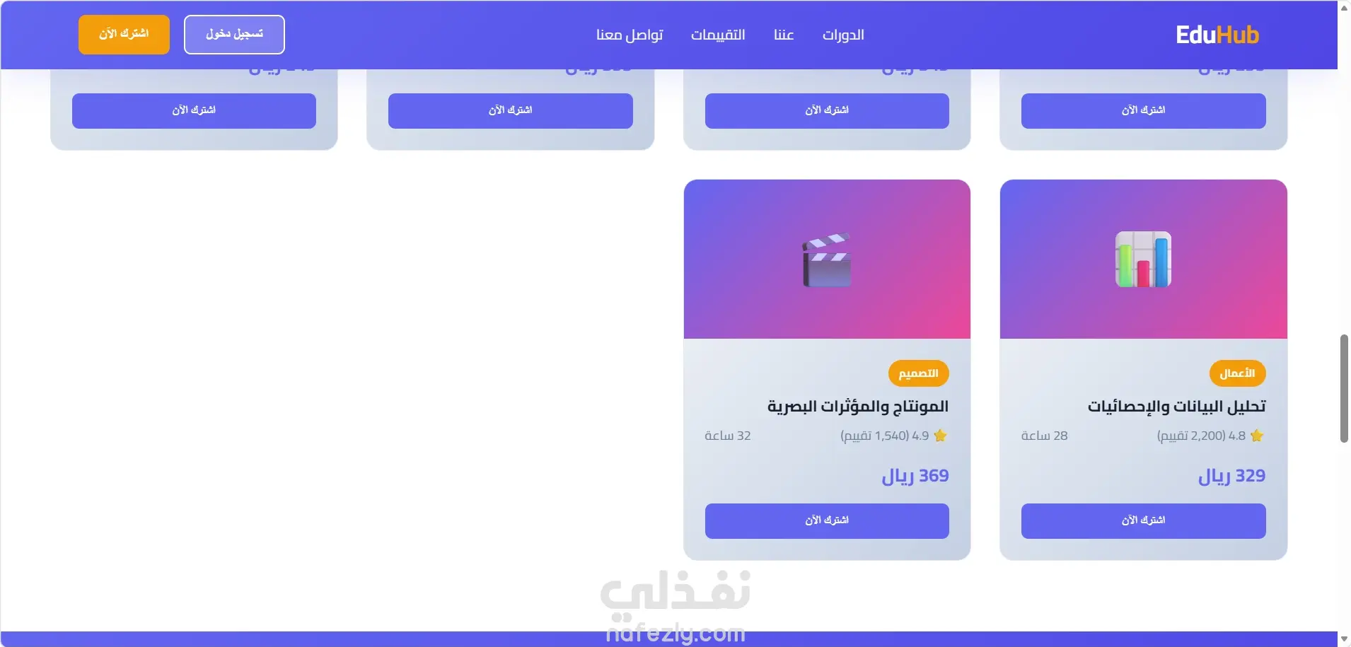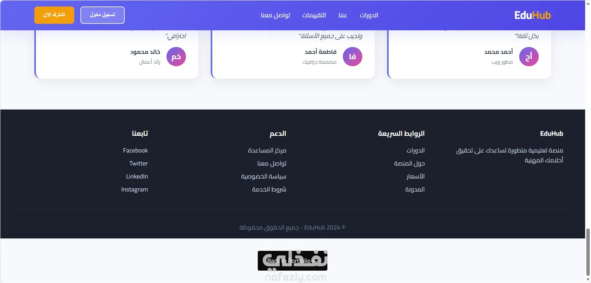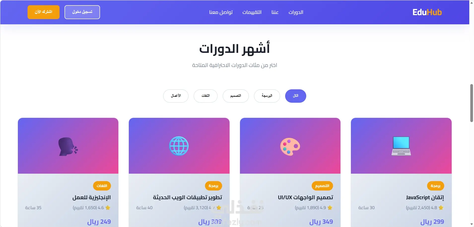 تصميم واجهة منصة تعليمية متكاملة — EduHub EduHub منصة تعليمية عربية مبنية بـ HTML وCSS وJavaScript، تتيح للمستخدمين تصفح مئات الدورات في مجالات متنوعة كـ JavaScript وUI/UX وتطوير الويب وتحليل البيانات والإنجليزية والمونتاج. تضم المنصة قسم مميزات يبرز المعلمين المتخصصين وإمكانية التعلم في أي وقت والشهادات المعترف بها والدعم المستمر، بالإضافة إلى صفحة تقييمات الطلاب وروابط سريعة وفوتر احترافي. تصميم عربي أنيق يدعم RTL مع واجهة جذابة ومريحة للعين.