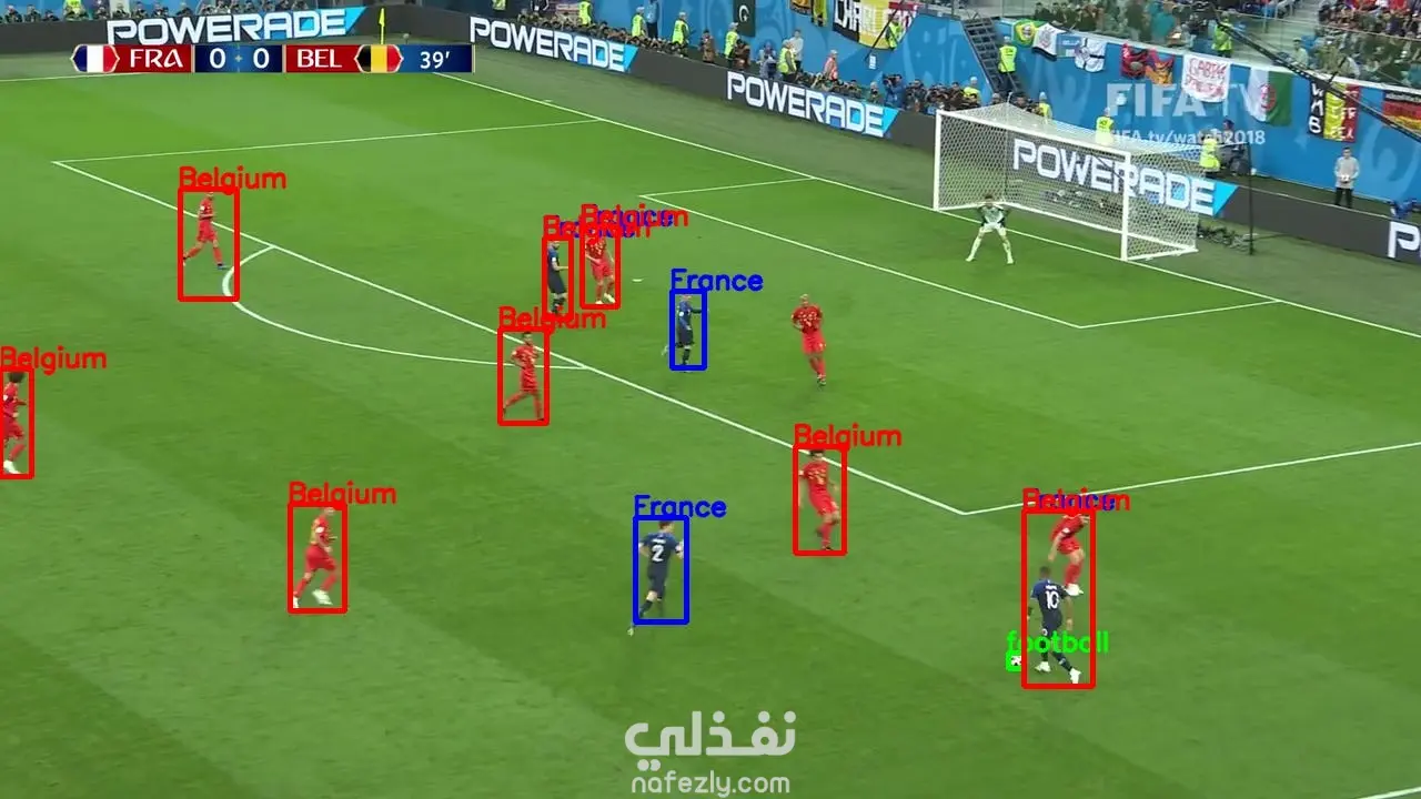 The system analyzes video frames and automatically identifies players and the ball in real time.