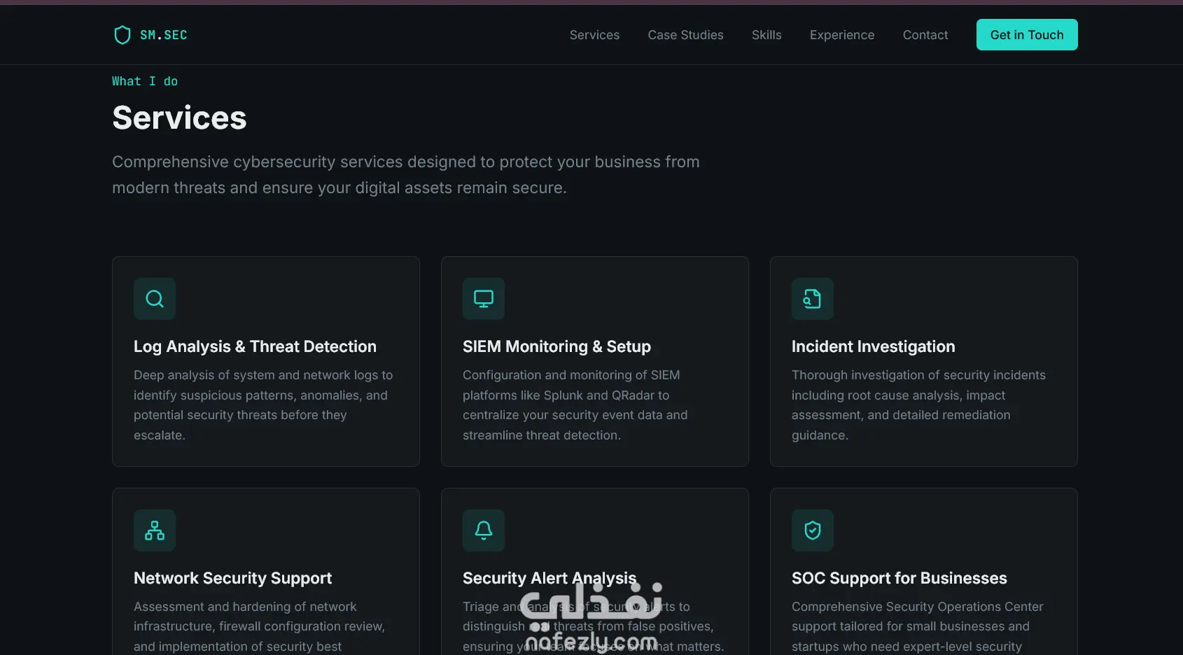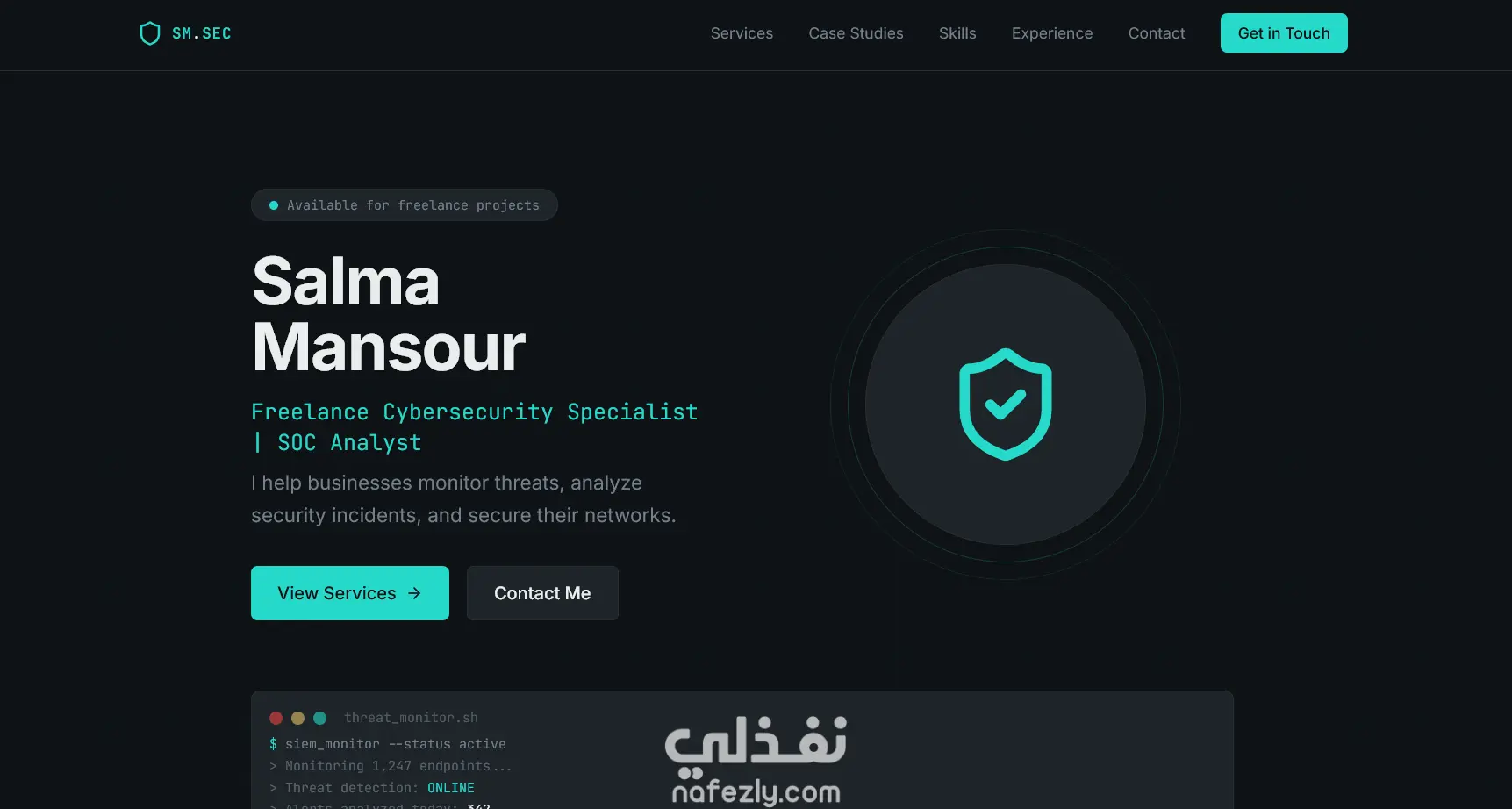 قمت بتصميم وتطوير موقع Portfolio احترافي لمتخصص في الأمن السيبراني (SOC Analyst) باستخدام Next.js و React. الموقع يعرض الخدمات الأمنية مثل: - تحليل السجلات (Log Analysis) - التحقيق في الحوادث الأمنية (Incident Response) - مراقبة الأنظمة عبر SIEM - دعم أمن الشبكات كما يتضمن الموقع دراسات حالة (Case Studies) واقعية توضح كيفية تحليل الهجمات واكتشاف التهديدات والاستجابة لها. تم تصميم الموقع بشكل احترافي مناسب لعرض الخدمات للعملاء والشركات في مجال الأمن السيبراني. سأقوم بتحليل التهديدات الأمنية والتحقيق في الحوادث السيبرانية
