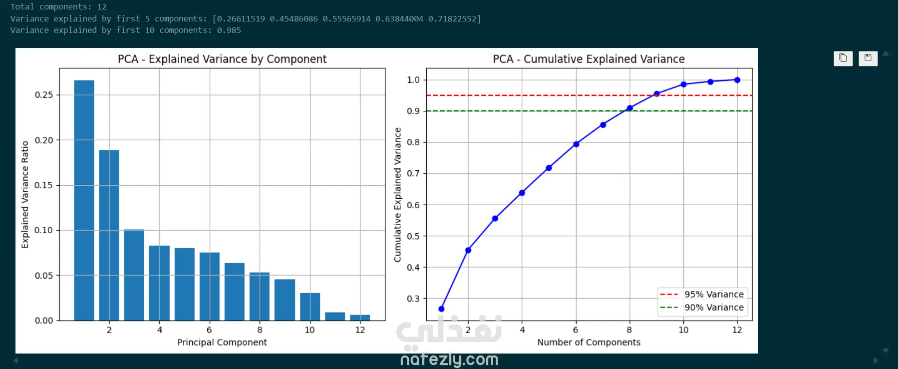 الخطوات والتقنيات المطبقة: تنظيف وتجهيز البيانات: التعامل مع القيم المفقودة باستخدام SimpleImputer، ومعالجة القيم النصية، وإنشاء ميزات جديدة (Feature Engineering) مثل 'سعر القدم المربع'. التحليل الإحصائي والبصري: دراسة توزيع الأسعار باستخدام Histograms. تحليل العلاقة بين المناطق والأسعار باستخدام Boxplots. فهم ارتباط المتغيرات ببعضها (Correlation) باستخدام Heatmaps. تقليل الأبعاد (Dimensionality Reduction): تطبيق PCA (Principal Component Analysis) لتقليل تعقيد البيانات مع الحفاظ على 90% من التباين (Variance). استخدام StandardScaler لتوحيد المقاييس قبل التحليل. تحليل نسبة التباين المفسر (Explained Variance Ratio) لتحديد أهم المكونات. هذا المشروع يبرز المهارة في التعامل مع البيانات عالية الأبعاد وتجهيزها لنماذج التعلم الآلي.