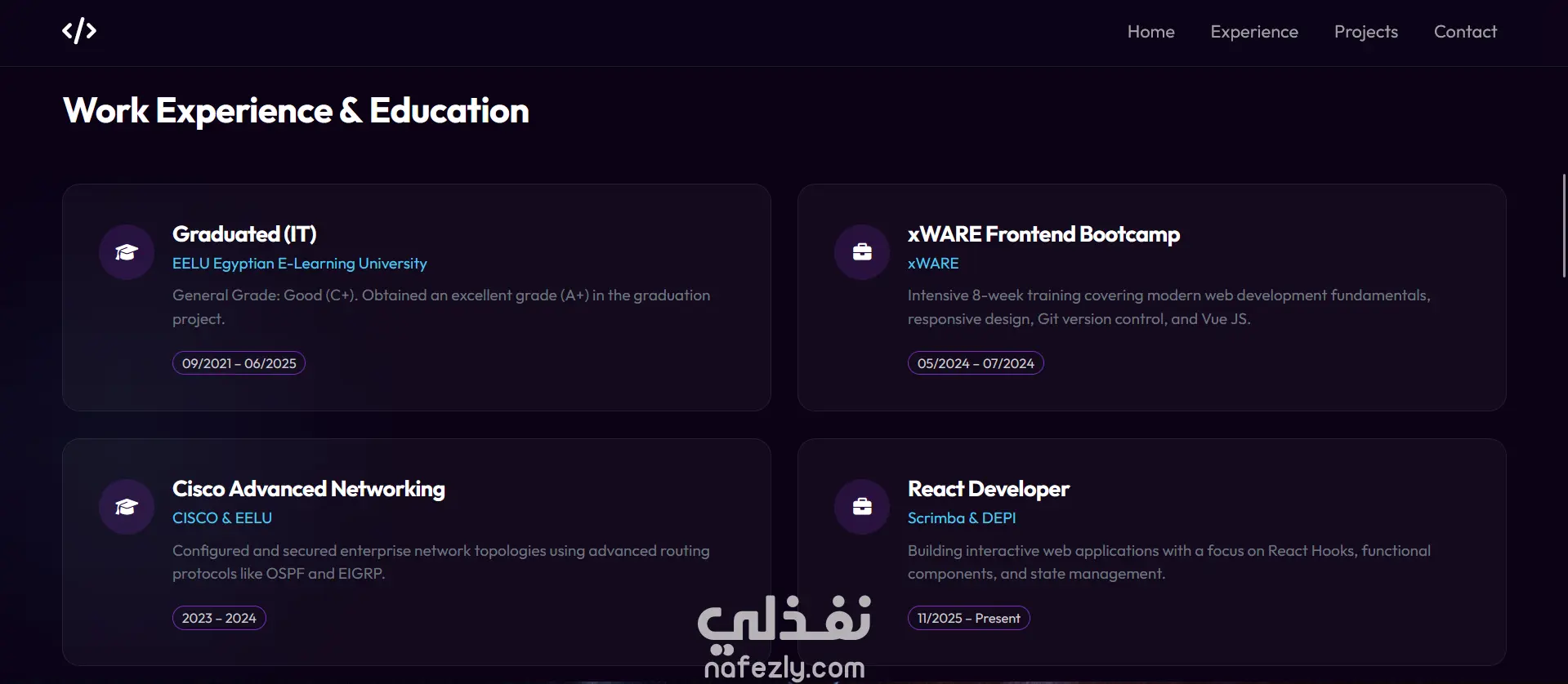 بناء موقع ويب شخصي متكامل ليكون واجهة احترافية لعرض خدماتي، مهاراتي، وسابقة أعمالي للعملاء. يهدف الموقع لتقديم تجربة مستخدم سلسة تعكس الهوية المهنية وتسهل التواصل. أبرز خصائص الموقع: 1- تصميم عصري ونظيف: التركيز على البساطة وتناسق الألوان لضمان راحة العين وسهولة التصفح. 2- عرض المشاريع (Showcase): قسم مخصص لاستعراض المشاريع السابقة مع روابط المعاينة وتفاصيل التقنيات المستخدمة. 3- تجاوب كامل (Fully Responsive): الموقع يعمل بكفاءة عالية وتصميم متناسق على جميع الأجهزة (موبايل، تابلت، ديسكتوب). 4- أداء عالي وسرعة تحميل: تم رفع الموقع واستضافته (Deployment) لضمان سرعة الوصول إليه في أي وقت.