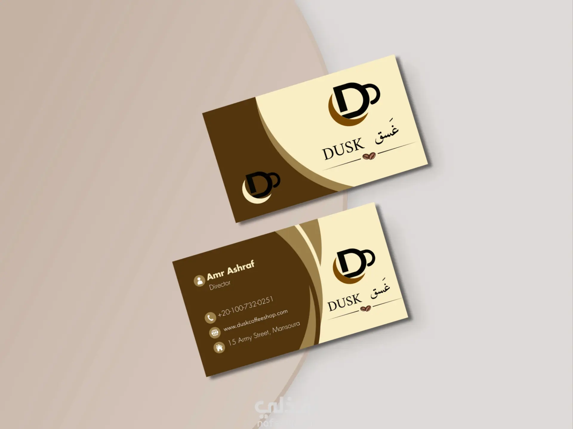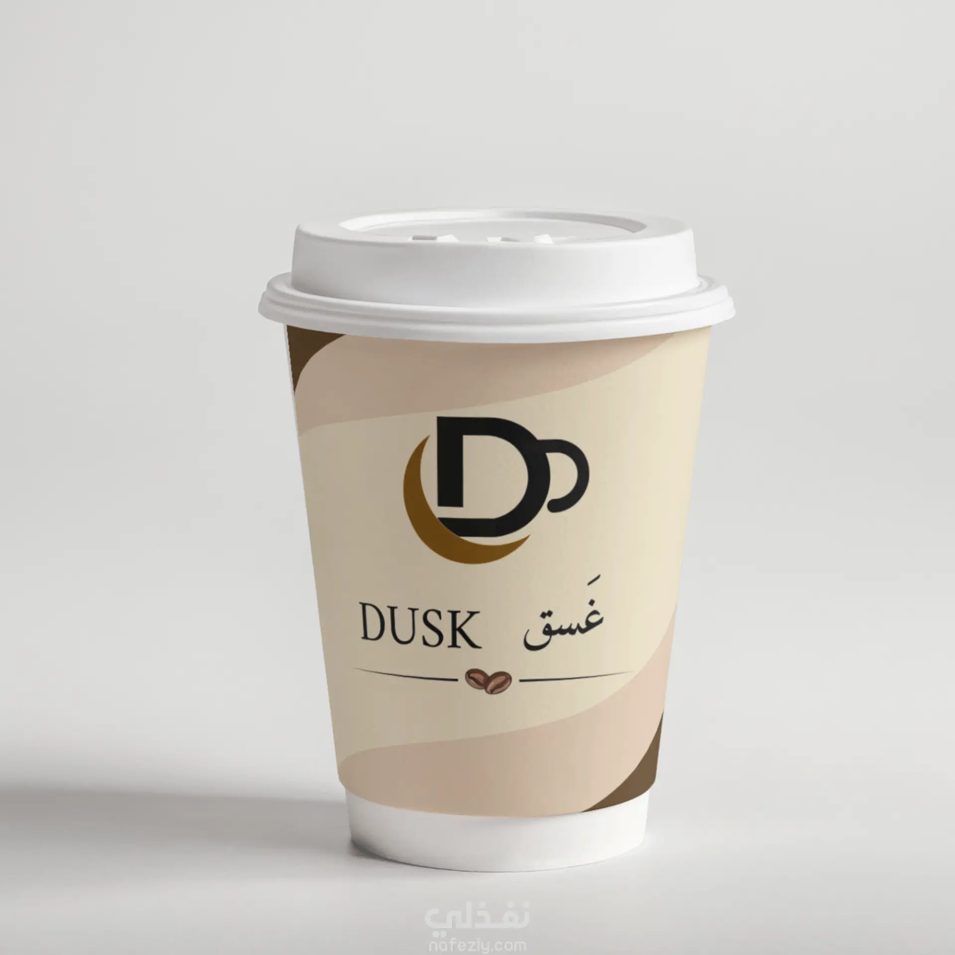 الشعار (Logo Concept): تم دمج الحرف الأول من الاسم الإنجليزي "D" بشكل مبتكر مع شكل فنجان قهوة، مدعوماً بلمسة هلال أسفل الكوب ليعبر عن اسم "غسق". لوحة الألوان (Color Palette): تم اختيار درجات البني (القهوة)، البيج (الكريمي)، والأسود، لإعطاء إحساس بالدفيء والجودة العالية. الخطوط (Typography): استخدام خطوط "Serif" كلاسيكية للكلمة الإنجليزية لإضافة لمسة فخامة، مع خط عربي انسيابي يتناسب مع روح العلامة. المطبوعات (Stationery & Mockups): تم تطبيق الهوية على كؤوس القهوة، كروت العمل (Business Cards)، وعناصر التغليف لضمان تناسق الهوية في كل نقاط التواصل مع العميل.