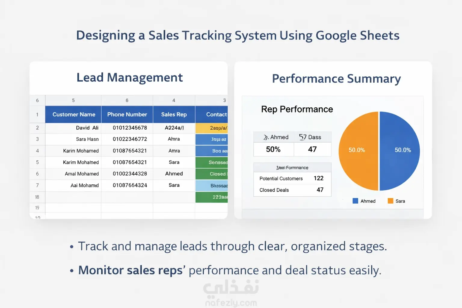 قمت بتصميم نموذج لنظام متابعة المبيعات باستخدام Google Sheets يساعد الشركات على متابعة العملاء المحتملين وتنظيم مراحل البيع بشكل واضح. يشمل النظام: - تسجيل بيانات العملاء - متابعة مراحل البيع - إنشاء تقارير بسيطة لمتابعة الأداء يساعد هذا النظام الشركات الصغيرة على تنظيم عمليات البيع وزيادة كفاءة المتابعة.