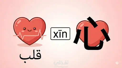 نموذج تعليمي لرمز "القلب" (心)، يوضح كيف أحوّل الرموز الصينية من خطوط مجردة إلى أشكال مألوفة يسهل على المبتدئين حفظها وتذكر نطقها الصحيح (Pinyin).