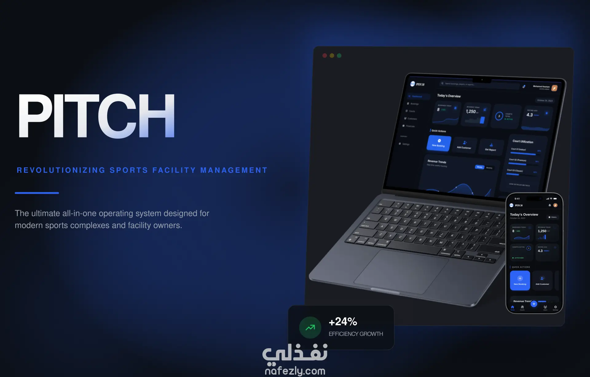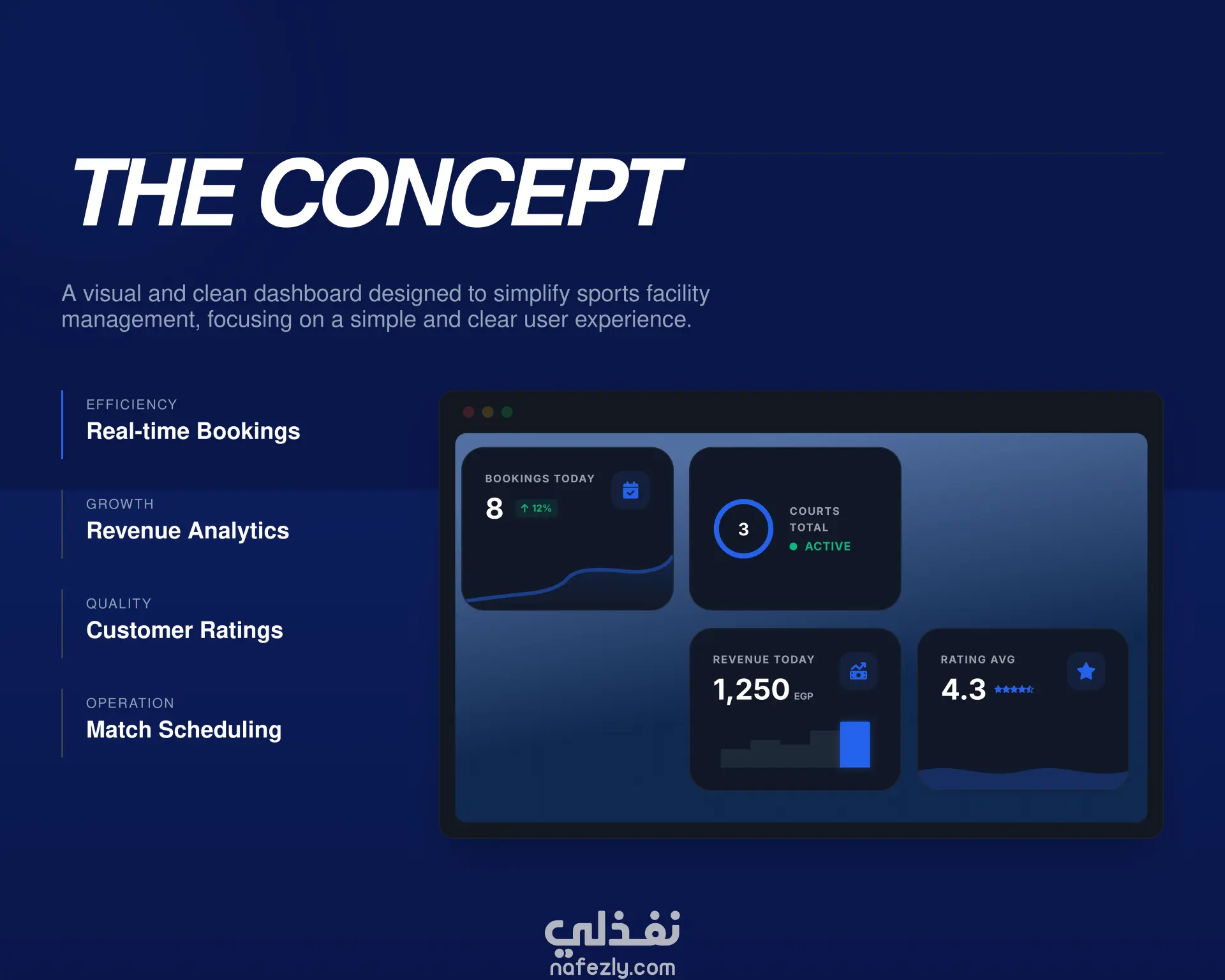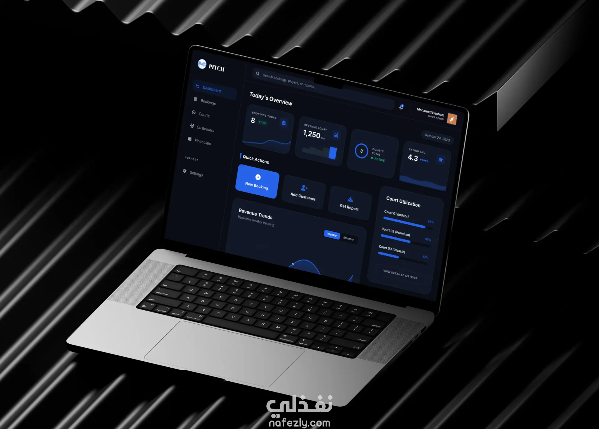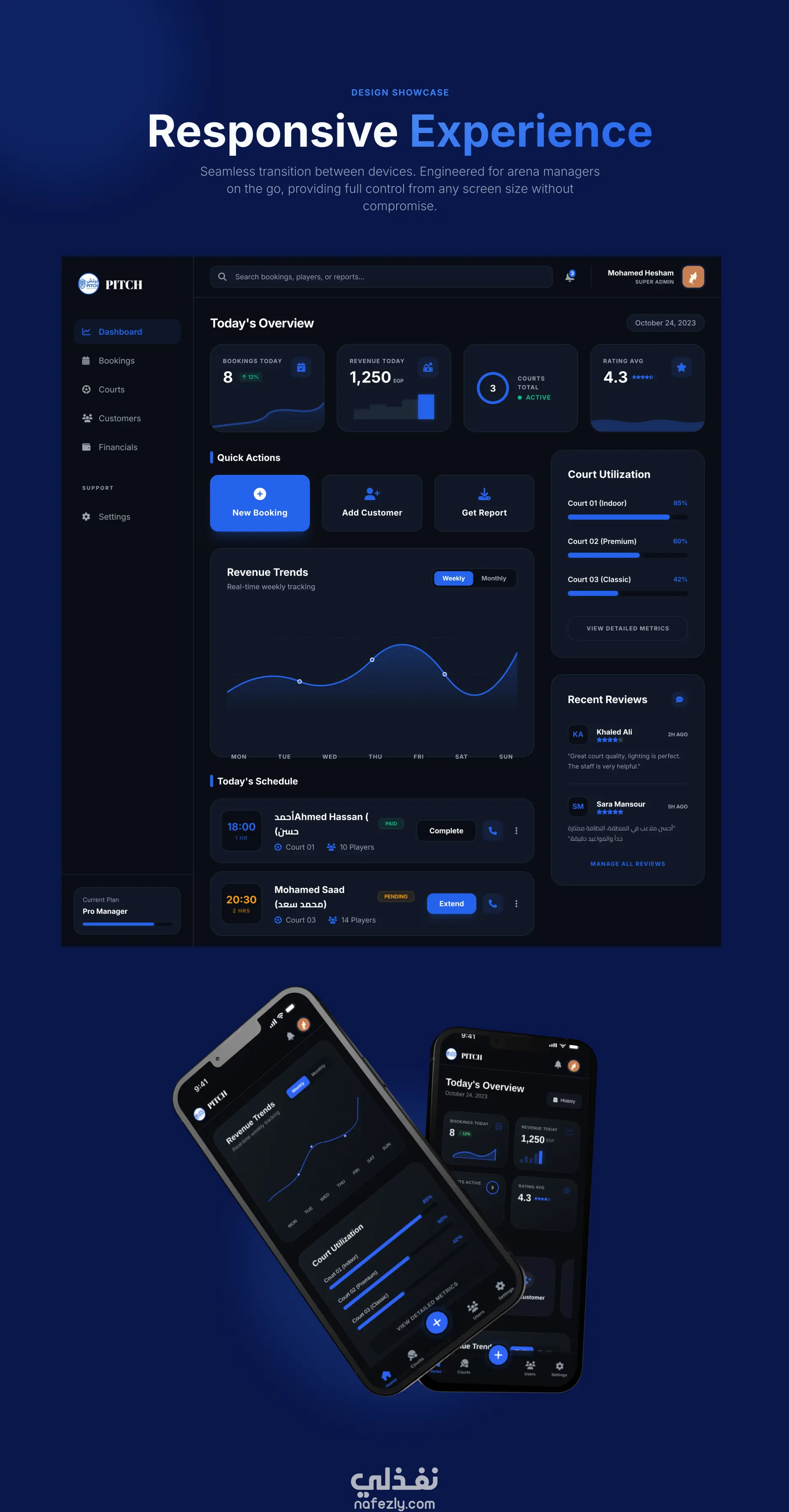 A clean and modern dashboard designed to simplify sports facility management. It provides a quick overview of bookings, revenue, court status, and reviews—all in one place. Built for managers on the go, with a fully responsive experience across all devices.