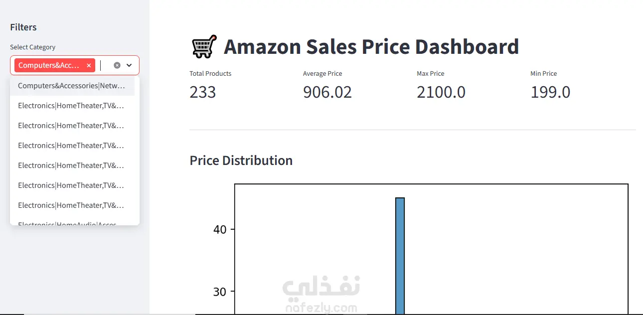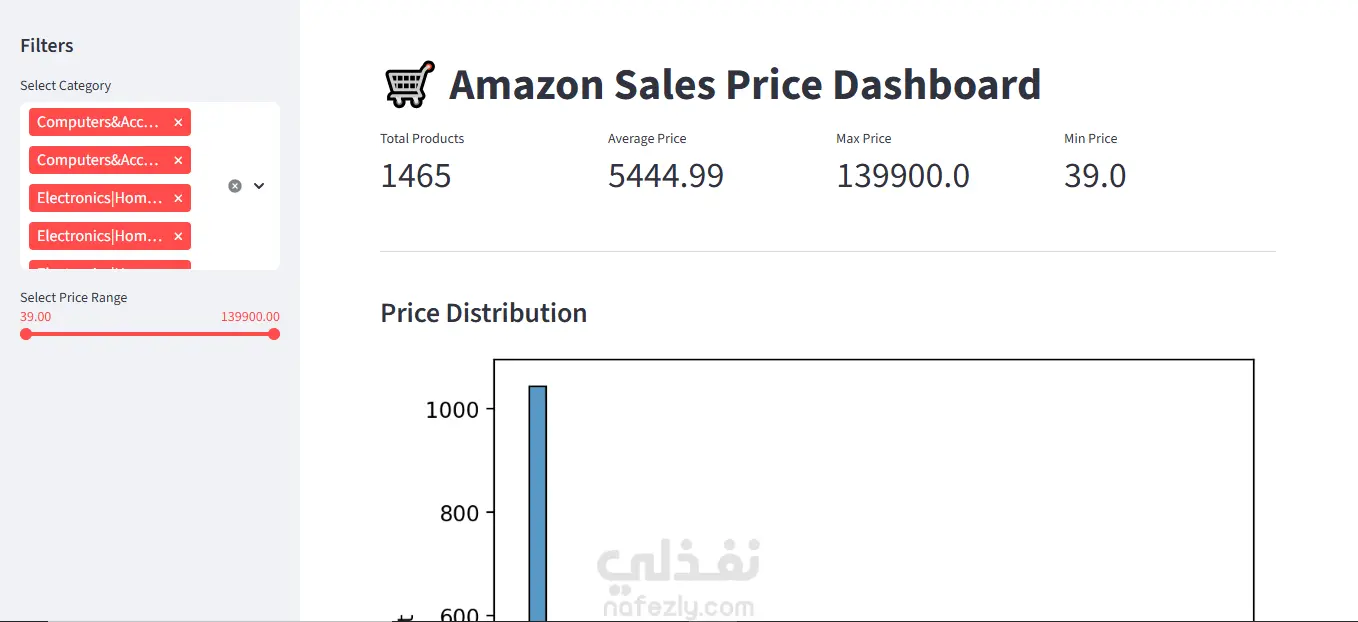 يهدف هذا المشروع إلى تحليل بيانات أسعار منتجات أمازون وبناء لوحة تحكم تفاعلية (Dashboard) لعرض النتائج بشكل مرئي وسهل الفهم. تم تنفيذ المشروع باستخدام لغة Python ومكتبات تحليل البيانات، مع تطوير واجهة تفاعلية باستخدام Streamlit لتمكين المستخدم من استكشاف البيانات بطريقة ديناميكية.