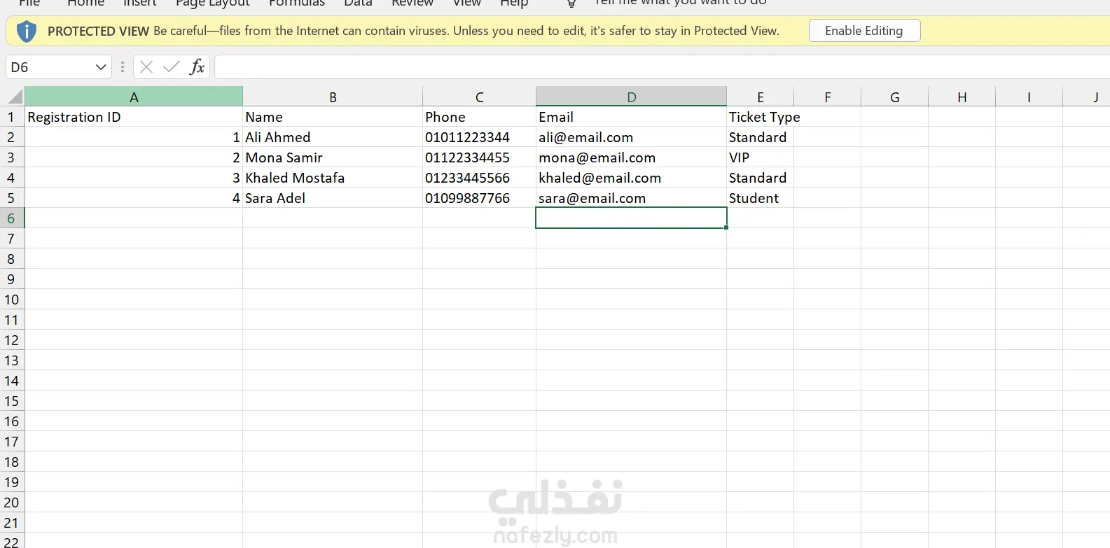 تنظيم بيانات تسجيل الحضور للفعاليات في جدول مرتب يشمل الاسم ورقم الهاتف والإيميل ونوع التذكرة.