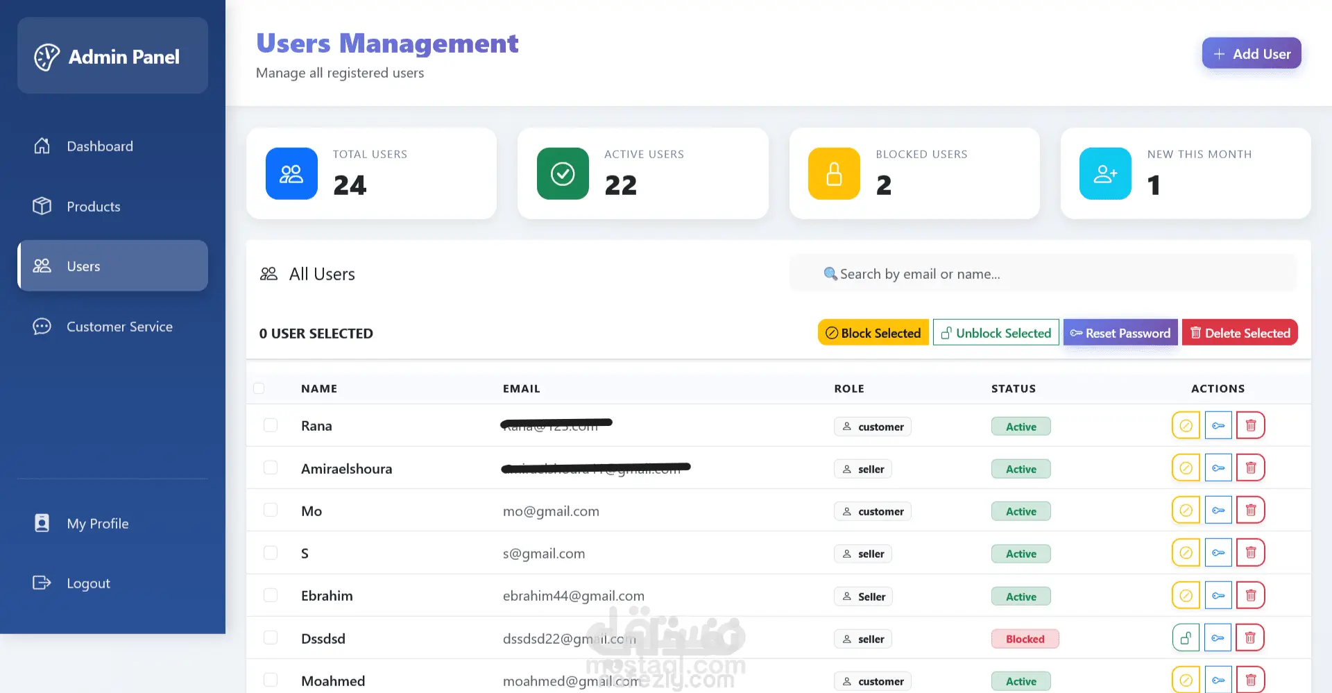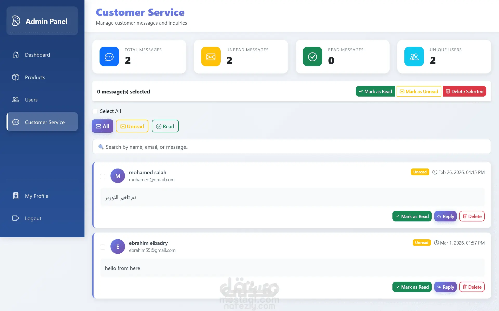 قمت بتصميم وتطوير لوحة تحكم إدارية شاملة لإدارة المتاجر الإلكترونية أو الأنظمة الإدارية، تركز بشكل أساسي على تسهيل اتخاذ القرار من خلال عرض البيانات بشكل بصري واضح، مع توفير أدوات تحكم كاملة في كافة أقسام النظام. تتكون لوحة التحكم من 4 أقسام رئيسية (كما تظهر في الصور): الرئيسية (Dashboard): عرض ملخص سريع للأداء يتضمن إحصائيات المستخدمين، المنتجات، المبيعات، والطلبات، مع رسوم بيانية توضح توزيع المستخدمين وفئات المنتجات والأرباح الأسبوعية. إدارة المنتجات (Products Management): نظام متكامل لإضافة وتعديل وحذف المنتجات، مع خاصية الفلترة المتقدمة (الكل، النشط، المعلق، نفد)، وإدارة المخزون بدقة. إدارة المستخدمين (Users Management): واجهة مخصصة للتحكم في حسابات العملاء والبائعين، تتيح حظر المستخدمين، إعادة تعيين كلمات المرور، أو تغيير الأدوار (Roles). خدمة العملاء (Customer Service): نظام لإدارة المراسلات والشكاوى، يسمح بفرز الرسائل (المقروءة وغير المقروءة) والرد السريع عليها أو حذفها.
