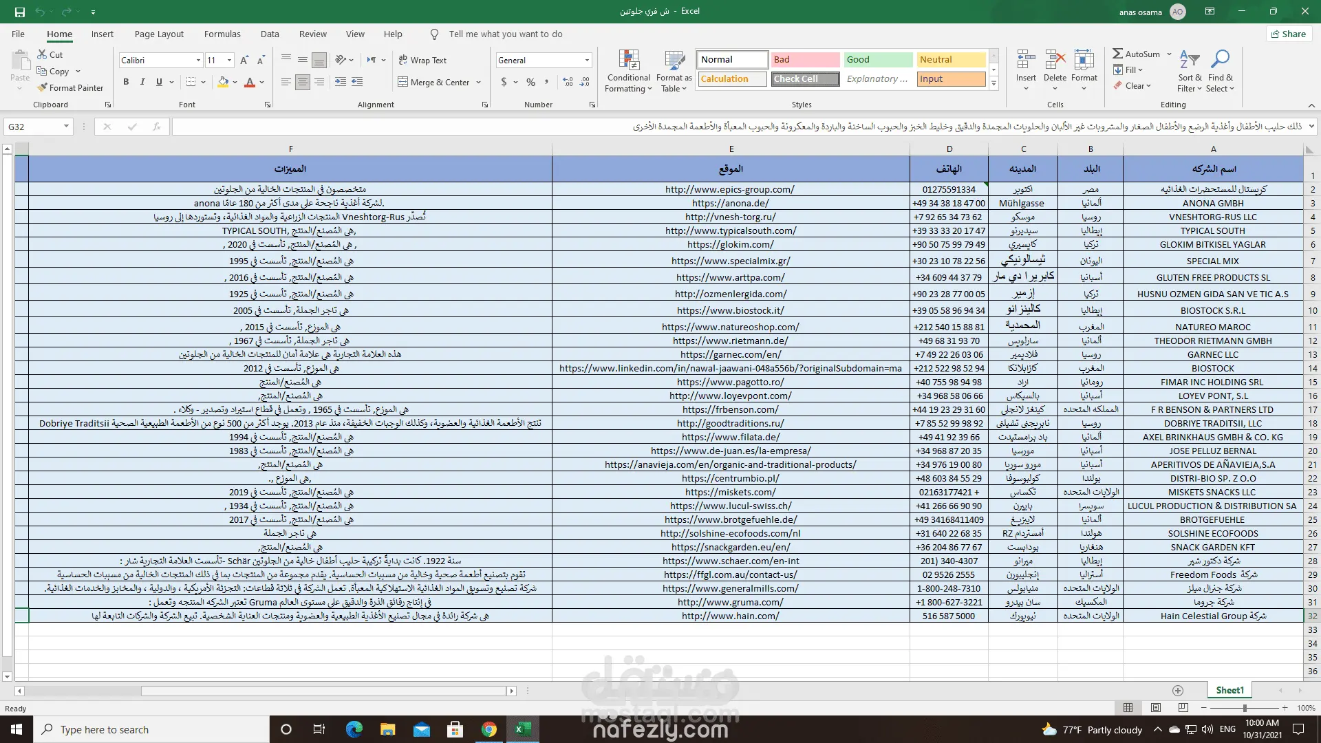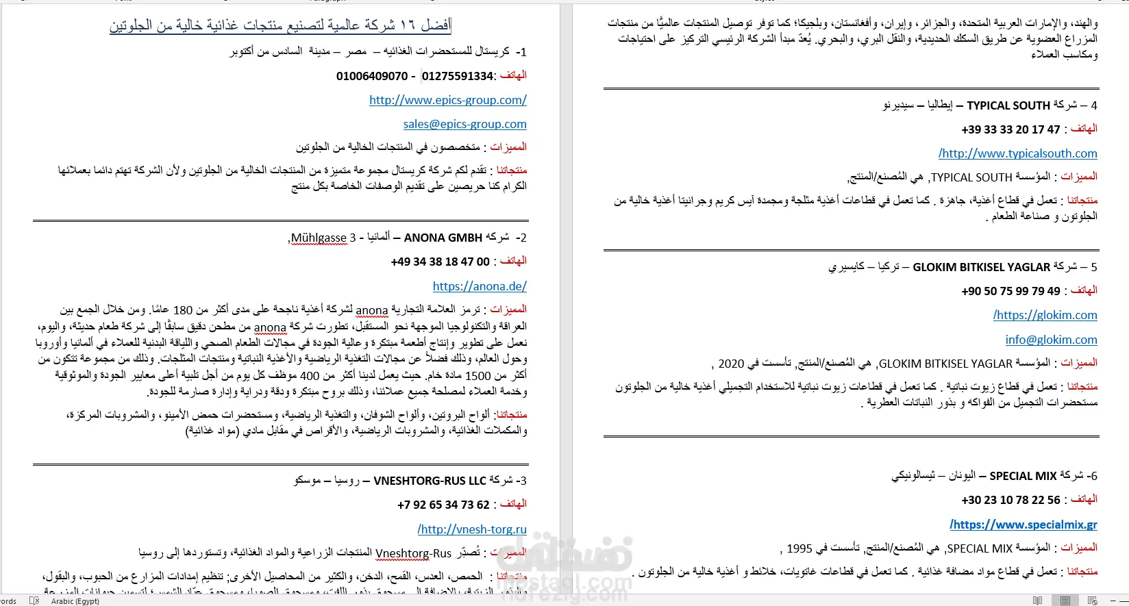 بحث وتجميع بيانات شركات مواد غذائيه خاليه من الجلوتين في ملف وورد واكسيل