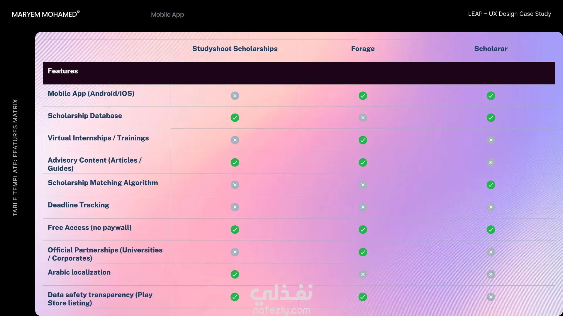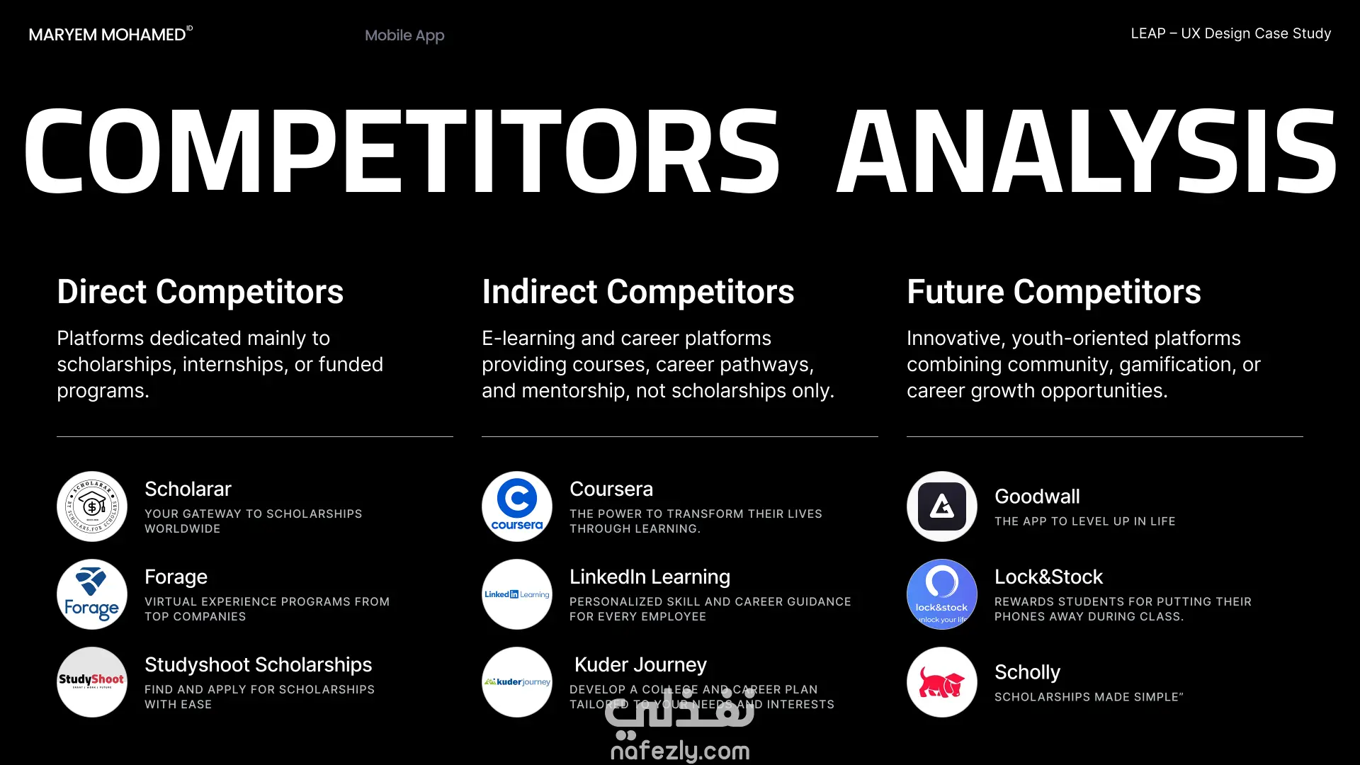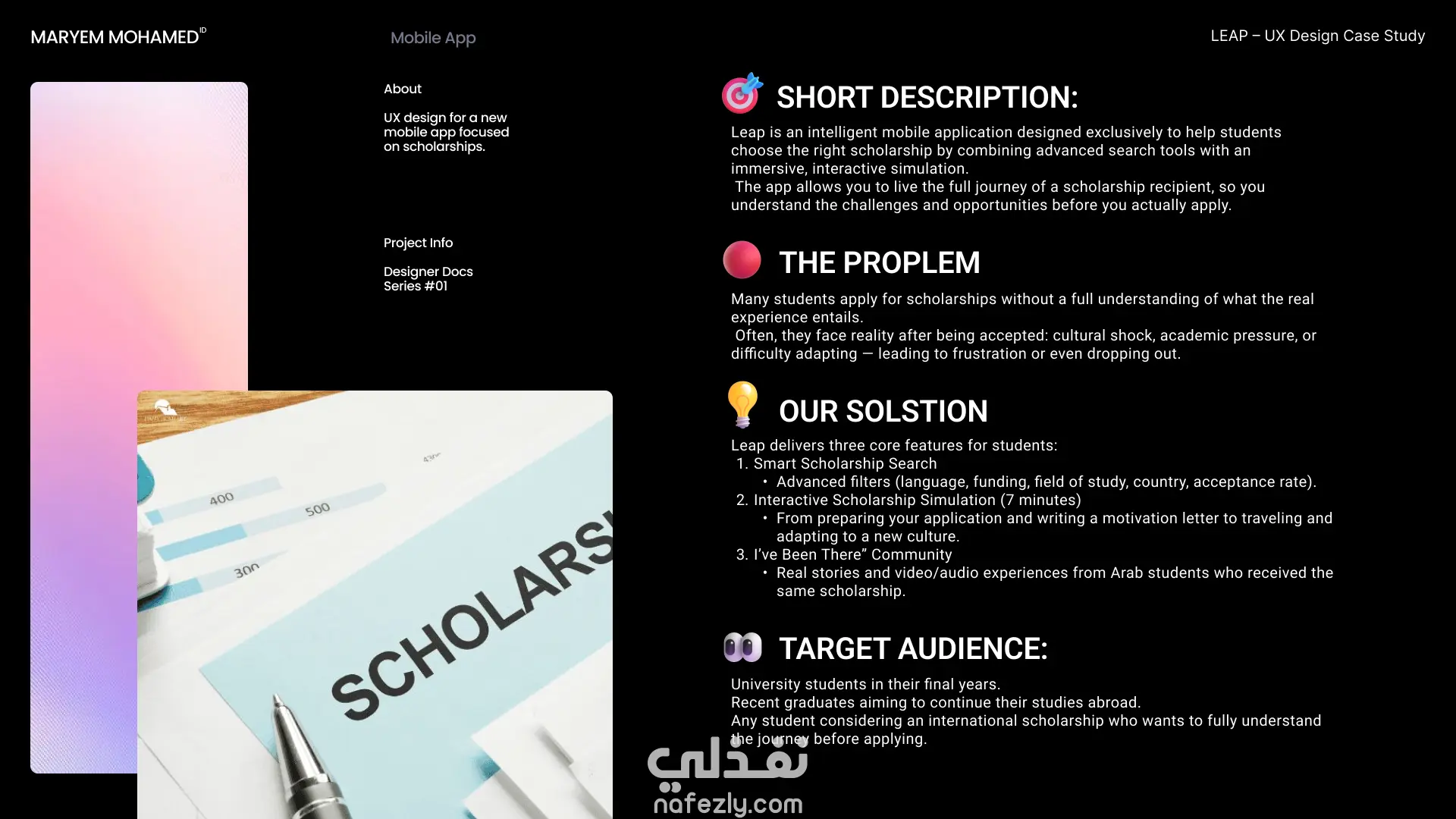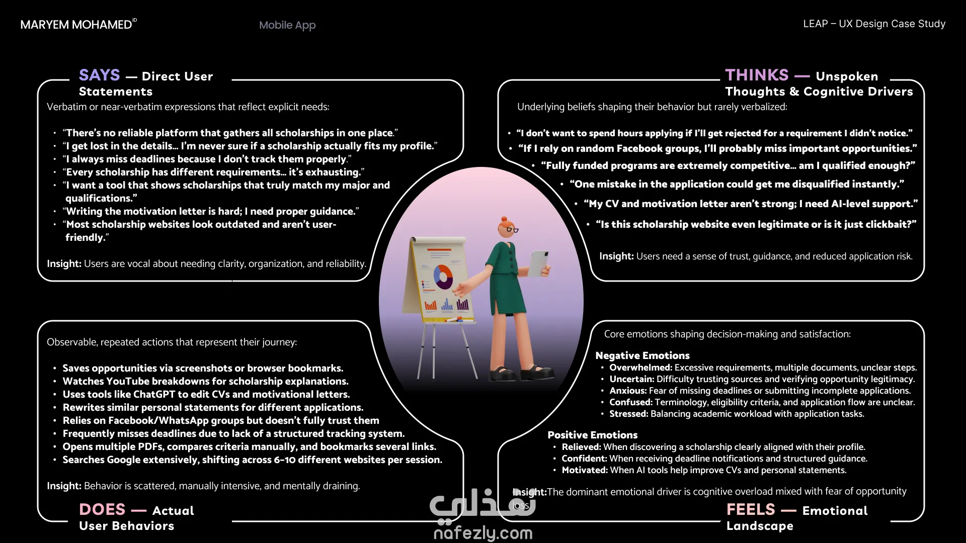 مشروع بحثي متكامل يركز على مرحلة ما قبل التصميم لتطبيق Leap المتخصص في المنح الدراسية. يهدف المشروع إلى فهم رحلة المستخدم وتحليل السوق لضمان بناء منتج رقمي فعال.