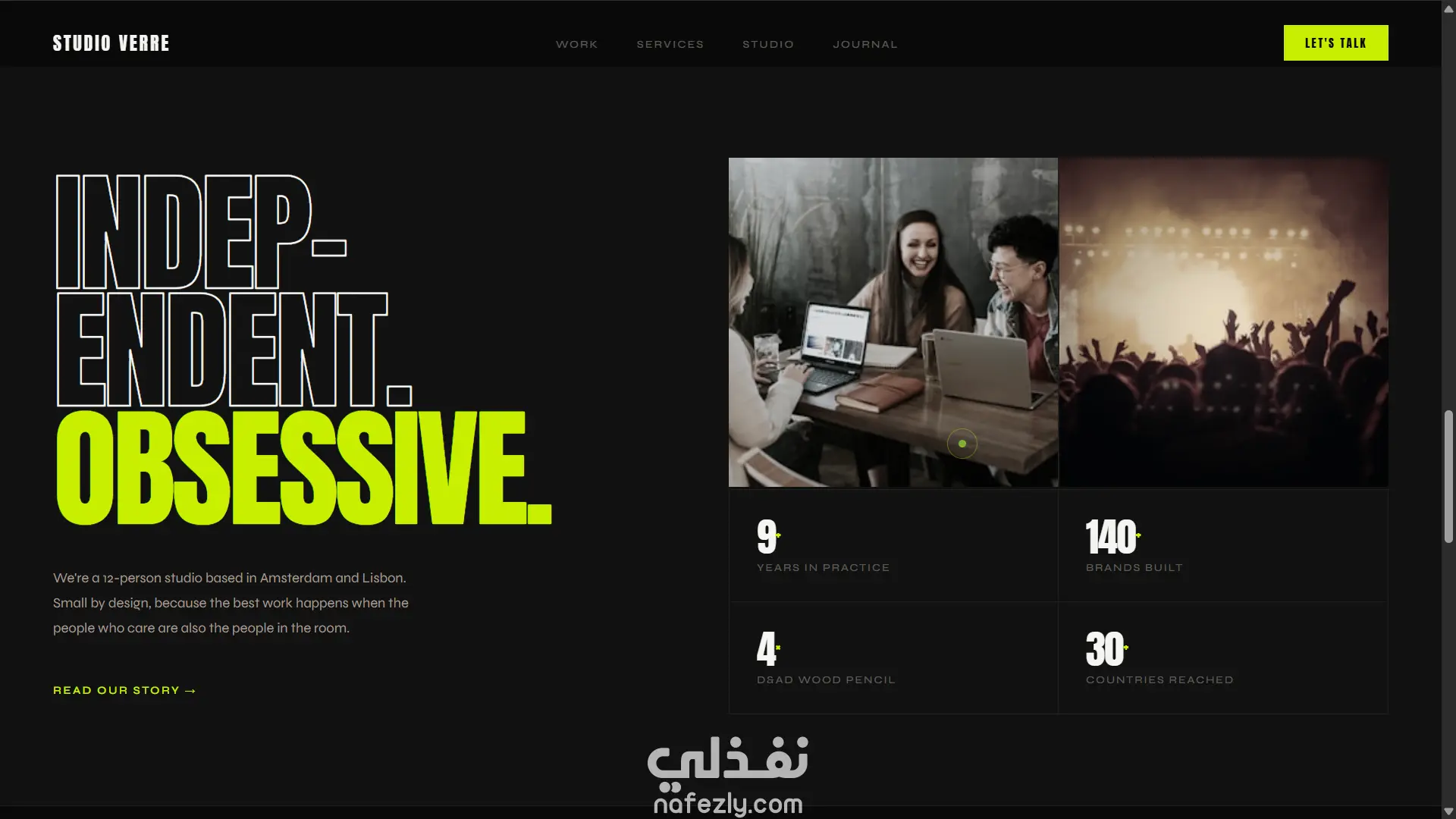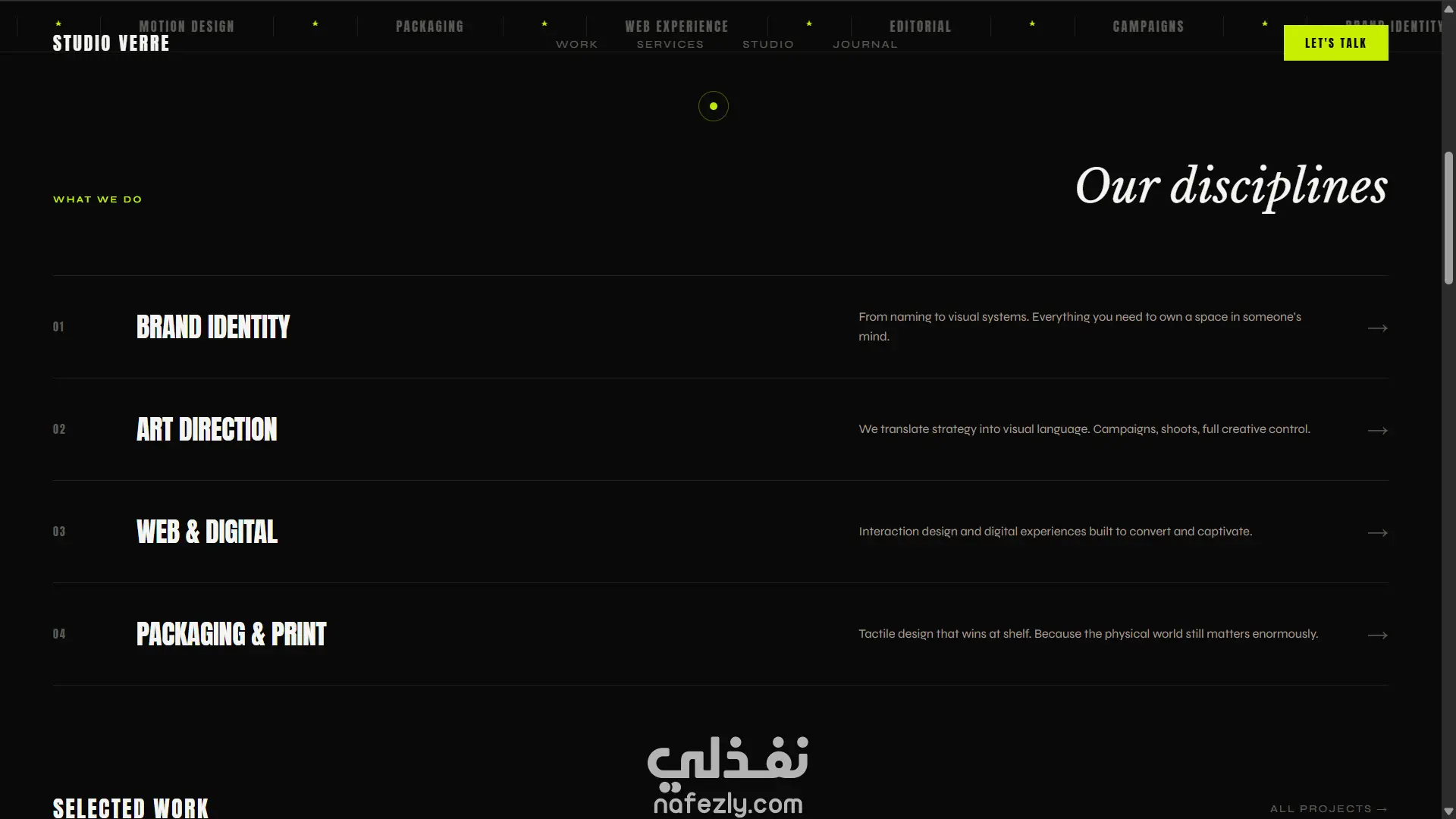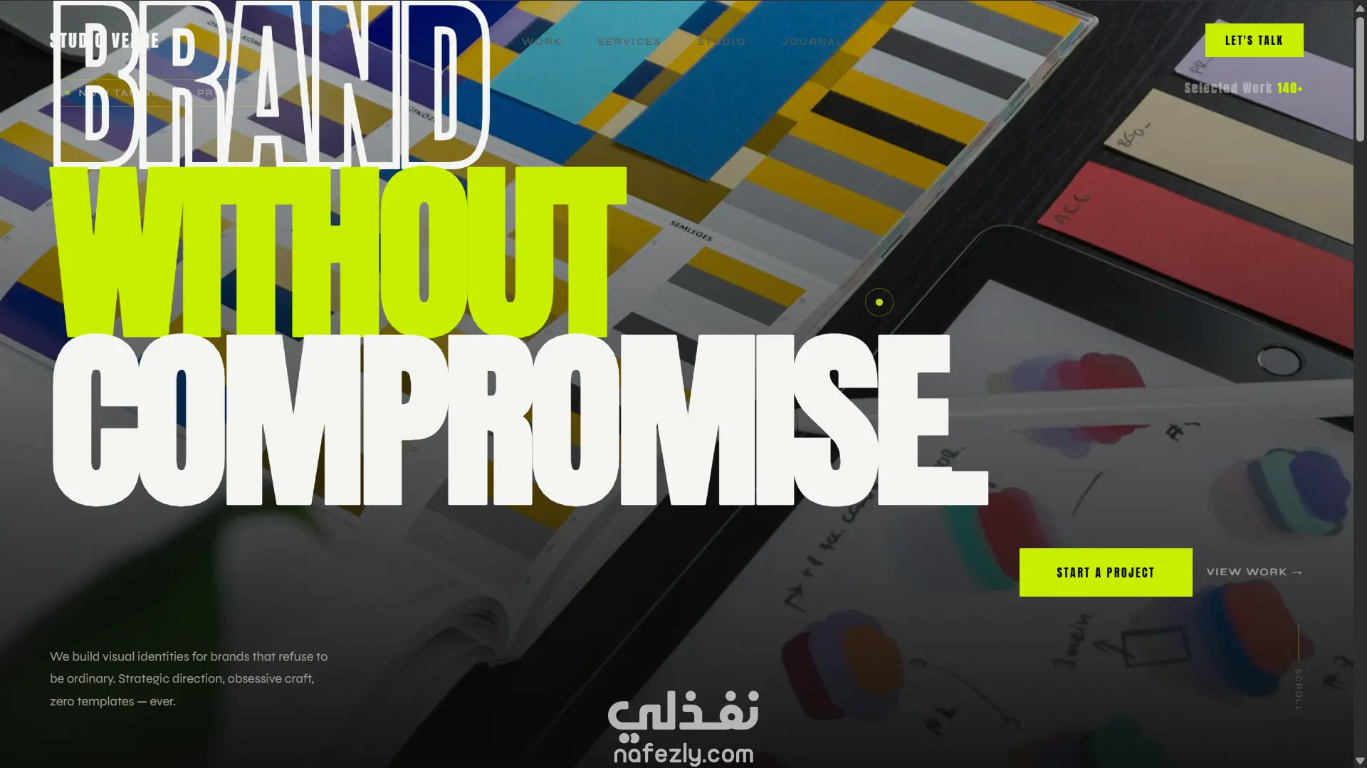 صفحة استوديو إبداعي (Agency): تصميم dark مع أخضر ليموني كأكسنت، صورة hero fullscreen مع zoom animation، خدمات تتحول بالكامل عند الـ hover، شبكة أعمال بصور حقيقية، وcursor مخصص.