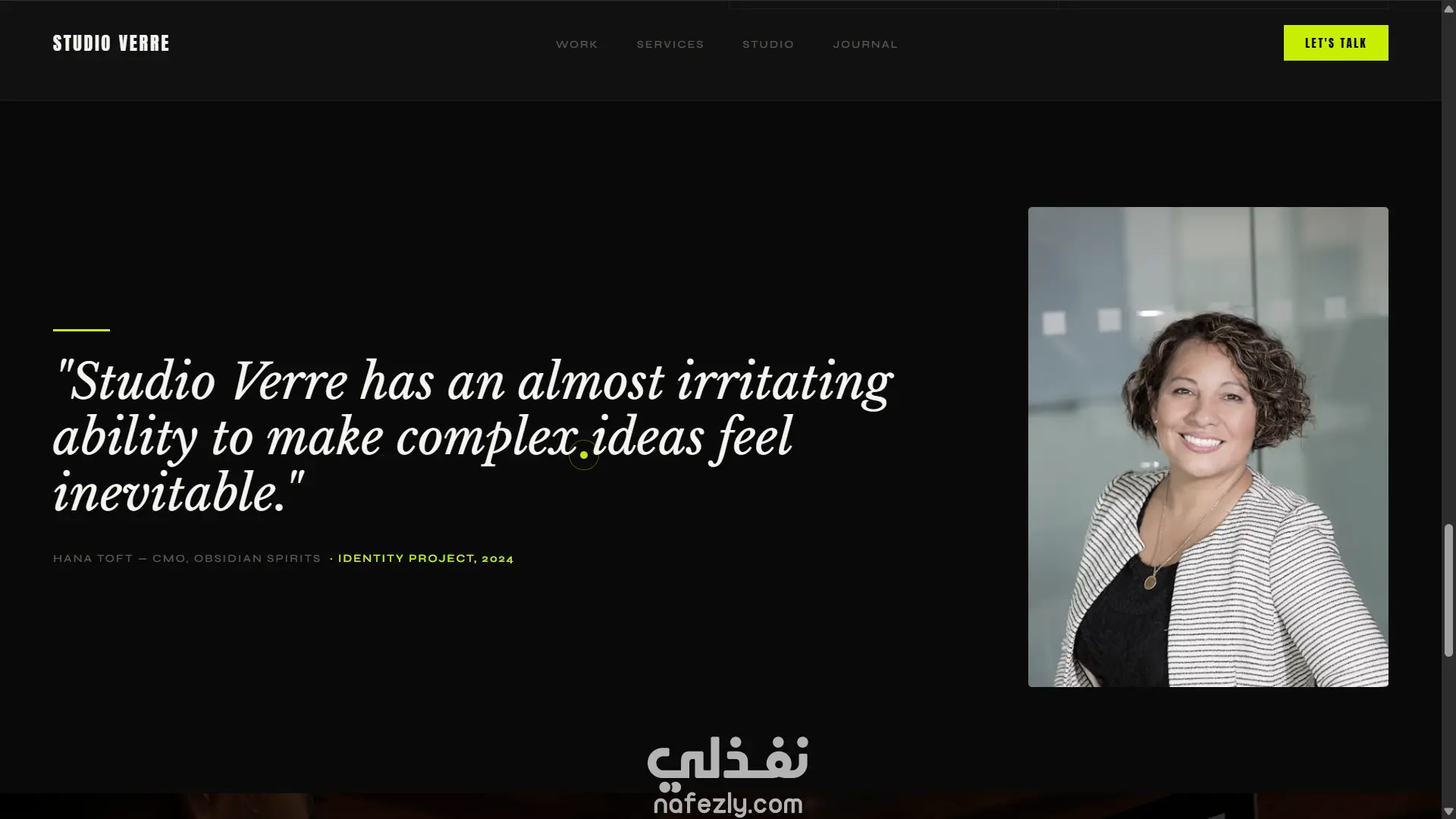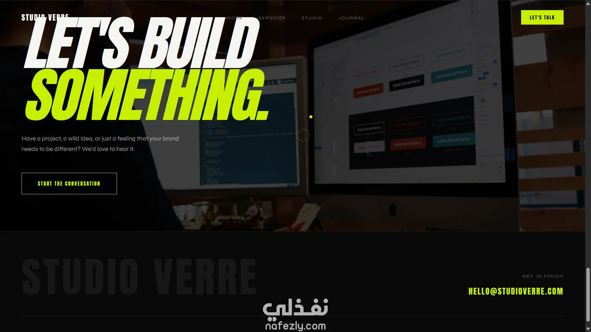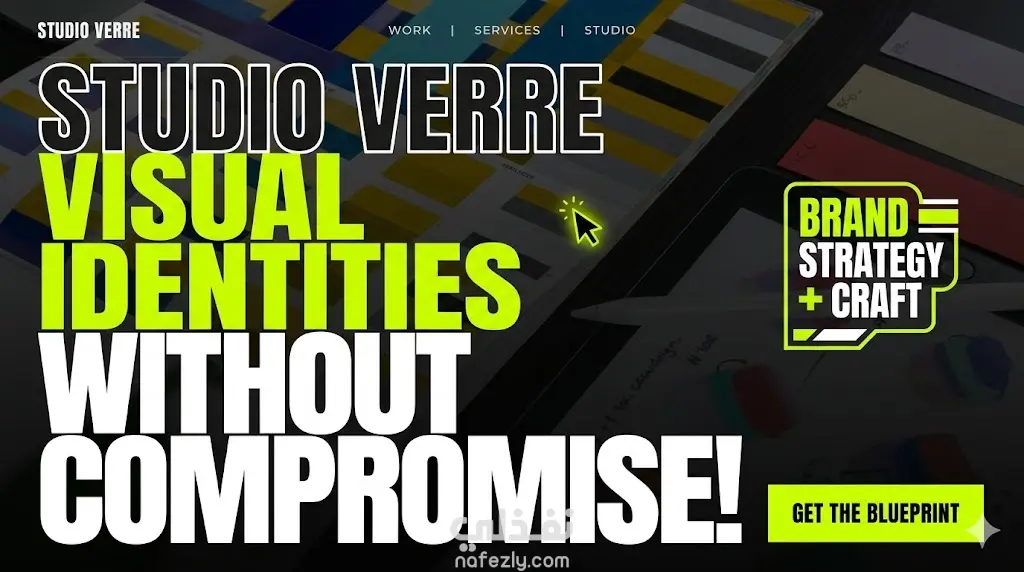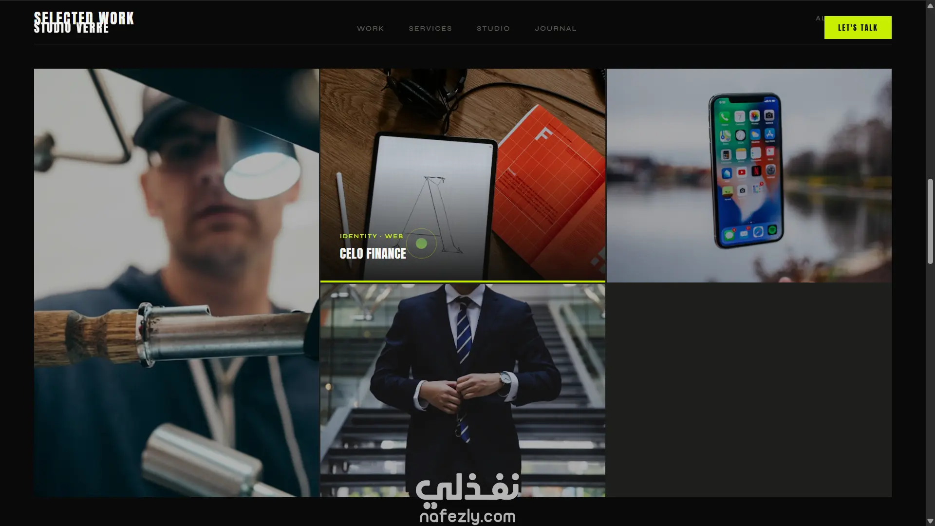 صفحة استوديو إبداعي (Agency): تصميم dark مع أخضر ليموني كأكسنت، صورة hero fullscreen مع zoom animation، خدمات تتحول بالكامل عند الـ hover، شبكة أعمال بصور حقيقية، وcursor مخصص.