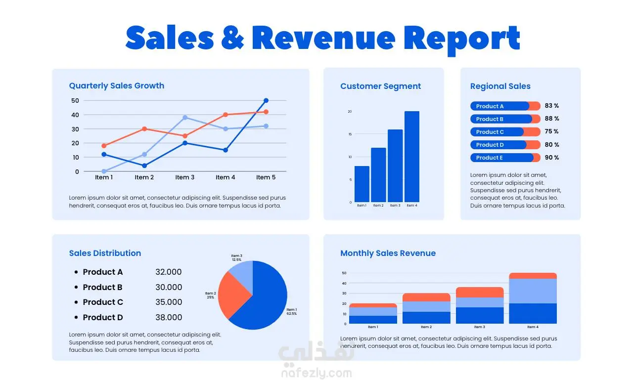 تحويل البيانات: تحويل الجداول الضخمة والمعقدة إلى رؤى بصرية واضحة تدعم اتخاذ القرار. • لوحات التحكم (Dashboards): تصميم واجهات تفاعلية تعرض مؤشرات الأداء (KPIs) بأسلوب عصري وسهل القراءة. • تنوع النماذج: تشمل النماذج المعروضة تقارير مبيعات، تحليل مصروفات، ومتابعة أداء مالي دوري.