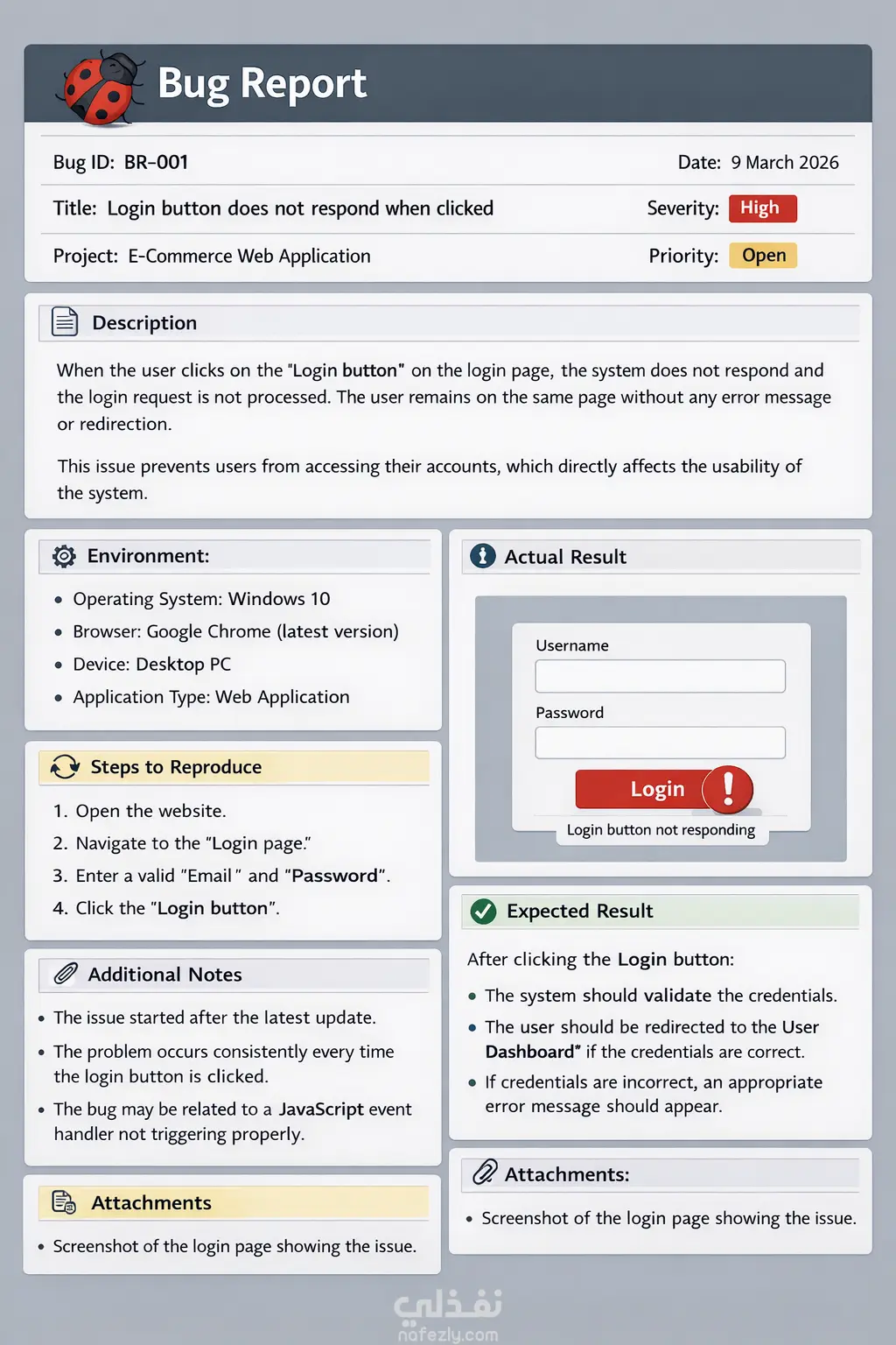 حص واختبار جودة البرمجيات (QA) تقارير تقنية منظمة (Bug Reports): ستحصل على تقرير احترافي (PDF/Excel) يتضمن: وصف دقيق لكل خطأ (Bug Description). خطوات إعادة إنتاج الخطأ (Steps to Reproduce).